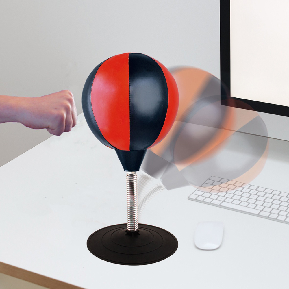Desktop suction cup inflatable boxing ball - a stress reliever and pressure release device for the office. Includes an air pump as a boxing reaction trainer.