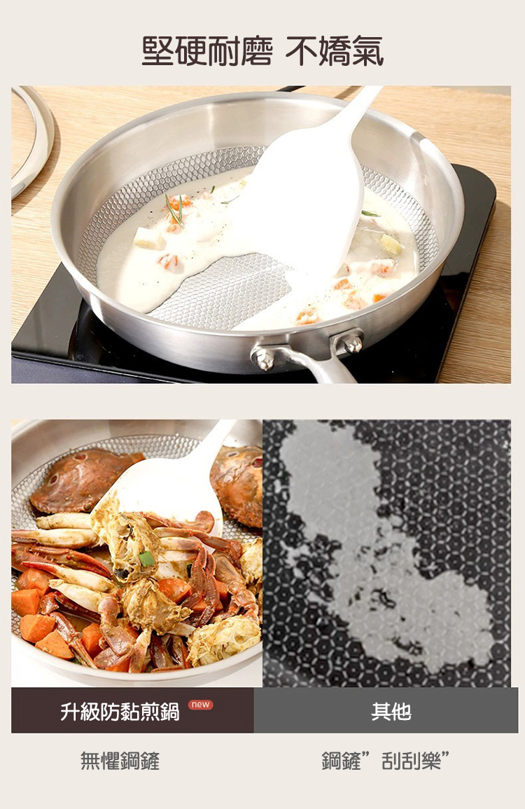 ●煎炒不沾溫控更佳●蜂窩設計持久不黏鍋底●不掉塗層持久又耐刮●多種爐具皆能適用規格:28cm帶蓋款尺寸:46*27.8*6cm(含蓋) 46*27.8*5.8cm(不含蓋)材質:316不鏽鋼、蜂窩層、鈦合金、強化玻璃鍋深:5.8cm(不含蓋)口徑:27.8cm鍋底直徑:28cm適用人數:2-3人重量:2005g材積:48.5*8.3*8cm包裝內容物:本體*1+手柄*1+透明鍋蓋*1+鍋蓋頭小配件包+小板手*1+說明書*1鍋蓋頭配件包內容物:鍋蓋頭*1鍋蓋片*1+塑膠墊圈*1