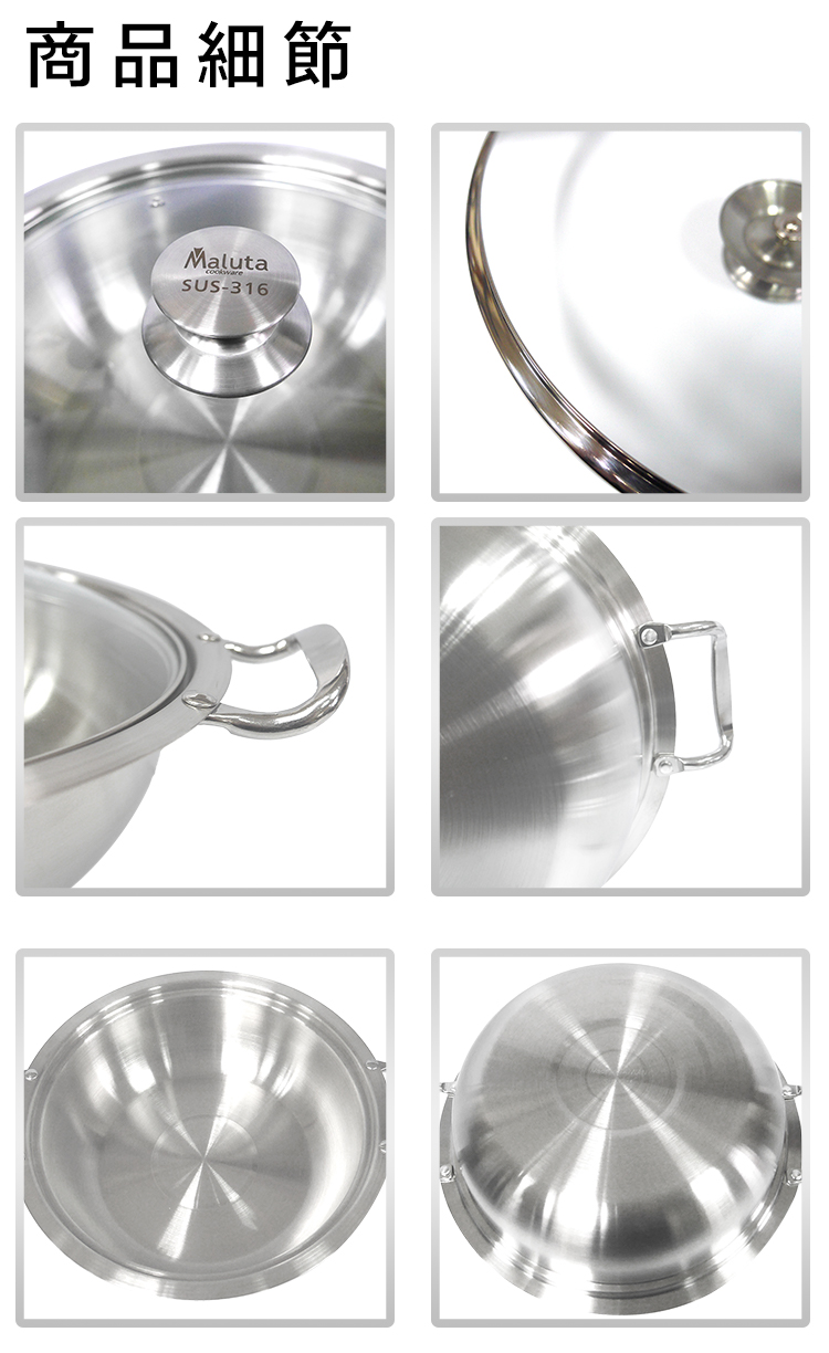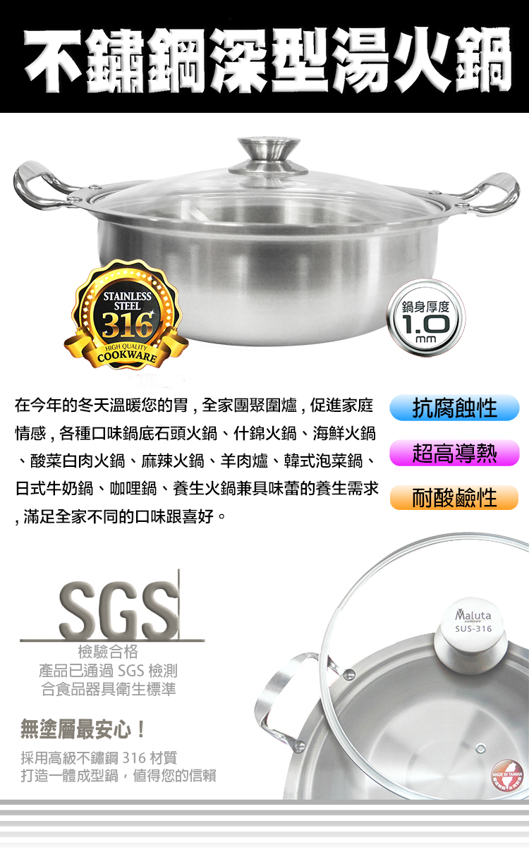臺灣製造SGS檢驗合格,採用頂級#316不鏽鋼材質,一體成型鍋身附鍋蓋,耐酸鹼耐腐蝕更安全,傳熱快速,導熱更均勻,可當火鍋、湯鍋、料理食物器皿,IH電磁爐對應,瓦斯爐、電爐、紅外線爐、電磁爐通通適用。