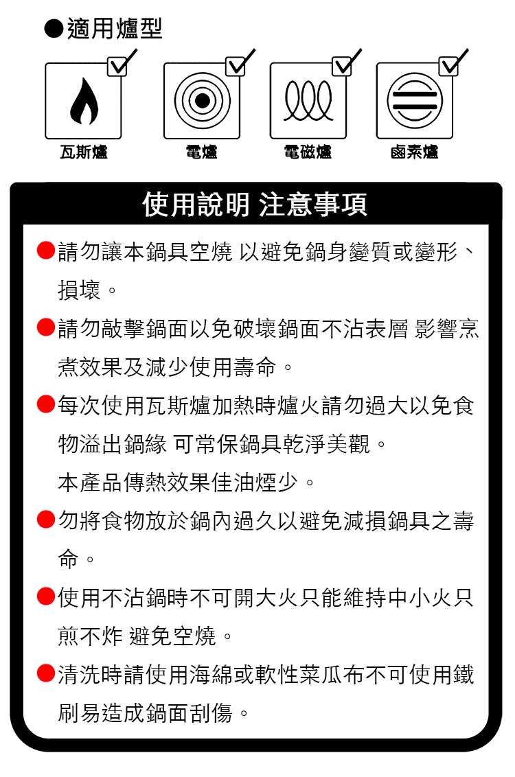 注意事項: 嚴禁空燒。 烹調後最好以隔熱手套拿取鍋蓋或把手,以免燙傷。
