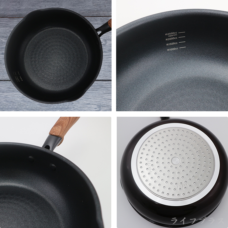 日本製造品質保証,採用合金+日本大金不沾塗層,可用鐵鏟超耐磨超耐用,傳熱快速,導熱更均勻,儲熱性佳,雙引水導角設計不回漏,適用IH電磁爐、紅外線爐、瓦斯爐、電爐、鹵素爐,仿木柄質感溫潤時尚美觀,一鍋多用料理食物好鍋具。 產品特性: 烹煮時將鍋內清洗,加熱後將適當的油順鍋內紋入倒入,煎、煮、炒、炸皆可。 使用柔軟布料或海綿及清潔劑於溫水中清洗,鍋身外則由以醋清洗擦拭即可保持光亮。 ◆商品不含展示品 注意事項 : 初次使用請用中性洗潔劑以海棉充份洗淨。 烹煮完成後,利用鍋子的餘溫清洗鍋子,可讓您減少清潔劑的使用,而且更簡單省力。 可使用軟質菜瓜布或海綿類清洗,請勿使用鐵刷、鋼絲球,延長使用壽命。 禁止用於微波爐,嚴禁空燒。 使用中時鍋體和手把金屬部份會變熱請小心注意。 每次烹飪完畢時,請務必將鍋內水分清理乾淨,請勿置放長時或隔夜。 鍋具表層請不要用鍋鏟杓敲擊,避免出現凹點或痕跡影響鍋面品質。