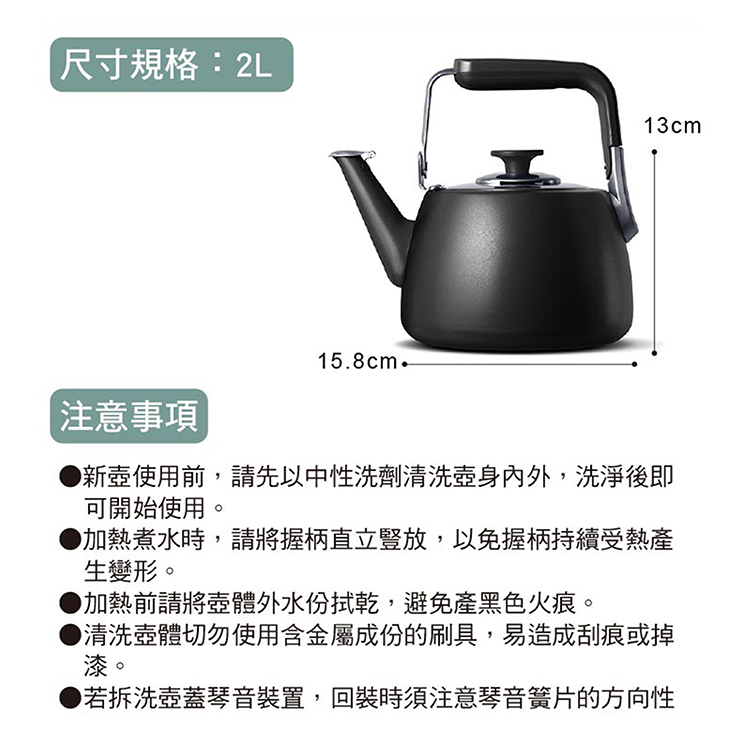 注意事項:新壺使用前,請先以中性洗劑清洗壺身內外,洗淨後即可開始使用。加熱煮水時,請將握柄直立豎放,以免握柄持續受熱產生變形。加熱前請將壺體外水份拭乾,避免產黑色火痕。清洗壺體切勿使用含金屬成份的刷具,易造成刮痕或掉漆。