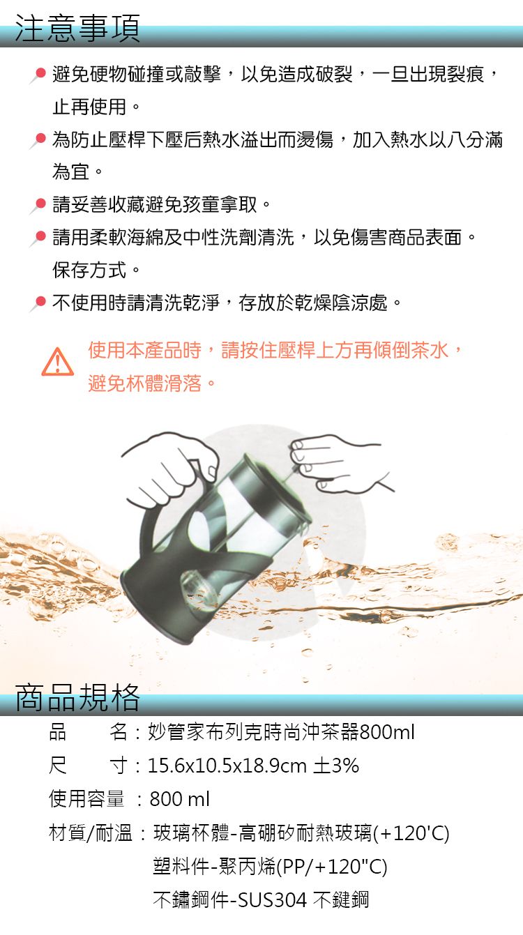 日式造型設計,304不鏽鋼細密濾網設計,可過濾茶渣,沖泡冷熱飲均可使用,採用直接沖泡及過濾原理,可使各式茶葉充分浸泡萃取精華,操作簡單,拆卸方便,清洗容易,高硼矽耐熱玻璃材質,耐高溫適合沖泡茶葉、花茶,沖泡中色澤一目了然。