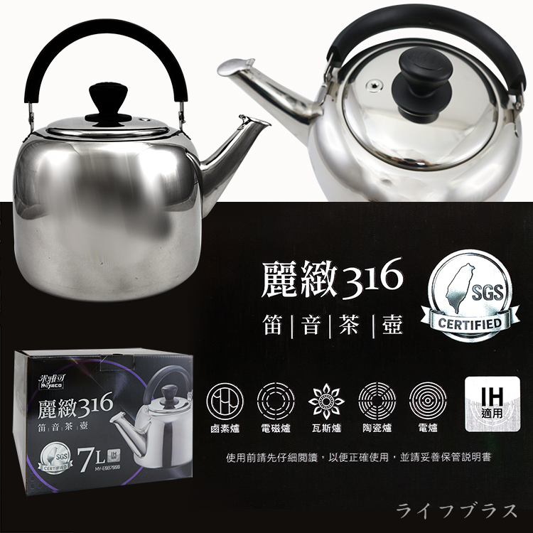 優雅造型體面大方,通過SGS檢驗合格 ,採用醫療級316加厚不鏽鋼,耐酸鹼抗腐蝕,不氧化,不腐蝕,不易產生水垢,堅固耐用品質優良,導熱均勻快速節能省時,壺蓋響音提醒功能設計,讓您可以隨時掌握水沸騰的時間,不在廚房內也可聽到聲音,使用安全,耐高溫防滑把手設計好握好拿,出水孔加蓋設計,防止異物侵入,適用IH電磁爐、卥素爐、紅外線爐、電爐、瓦斯爐。規格說明