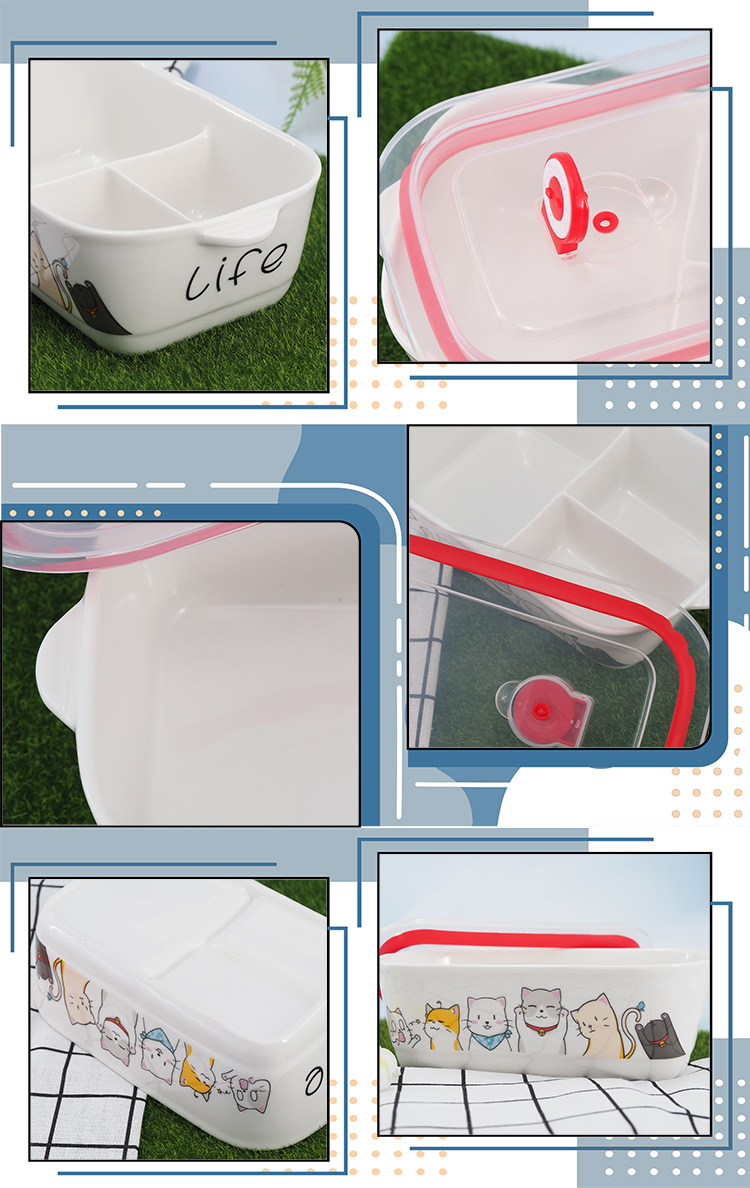 三格分格設計料理分裝,附蓋收納密封設計,可微波餐盒,陶瓷材質耐高溫,好沖好洗不沾污,適用烤箱、微波爐、洗碗機都OK,環保節能重覆使用,室內、外出用餐、學校皆可使用。