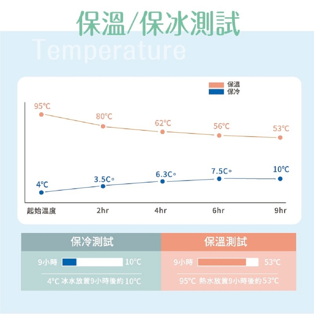 材質:瓶身內膽材質:SUS 304不鏽鋼、陶瓷塗層 外層材質:201不鏽鋼 杯蓋材質:改質PCT 墊圈材質:矽膠(Silicone) 提把材質:聚丙烯(PP) 吸管材質:聚乙烯(PE) 耐熱溫度:瓶身內膽耐熱溫度:約-20至100°C 杯蓋耐熱溫度:約0至90°C 墊圈耐熱溫度:約-20至100°C 提把耐熱溫度:約-10至100°C 吸管耐熱溫度:約-10至100°C