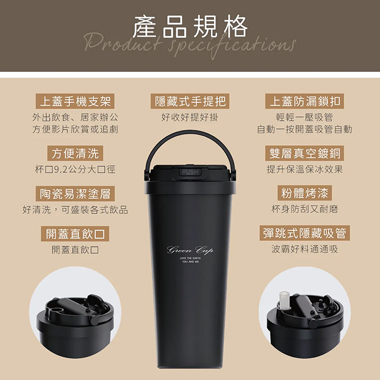 讓您可以輕鬆享受一杯美味的咖啡或茶,讓生活更加美好,SGS檢驗合格使用安心,瓶身內外層採用304不鏽鋼+陶瓷塗層材質,不挑飲品,不易殘留異味,大口徑容易清洗,污垢不易殘留,雙層真空鍍銅技術,保溫保冷效果長效,底部止滑設計,不易滑動,不怕刮傷,無論是在家裡、上班、上學、野外登山、郊遊旅行皆適用,造型優美時尚,攜帶方便,輕鬆帶出門,直飲口+吸管飲獨特的雙飲設計,讓您可以隨時隨地享受熱飲或冷飲。