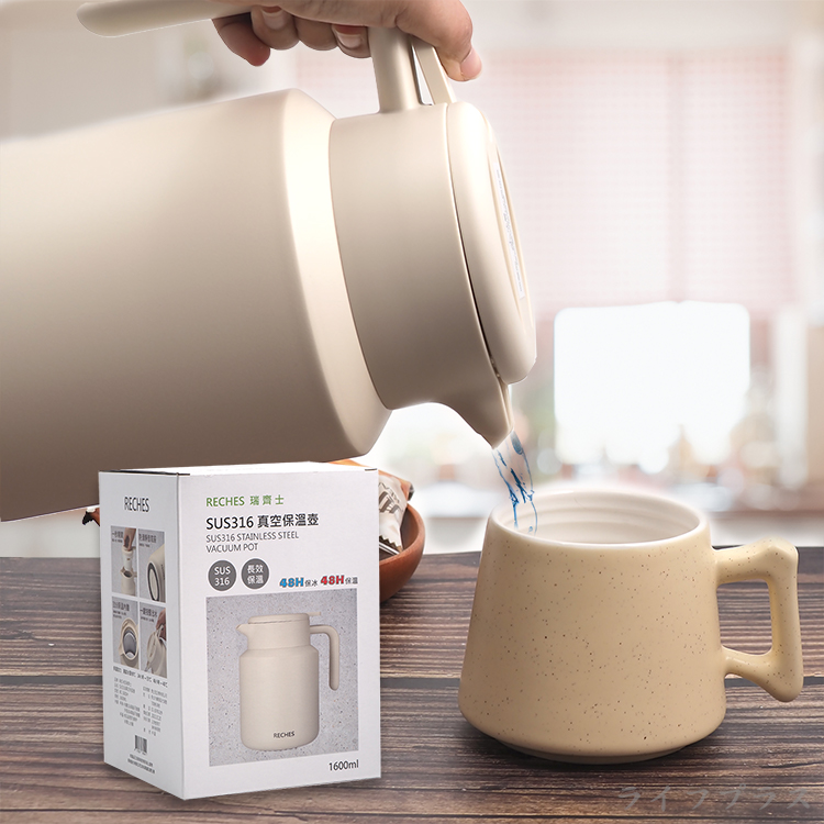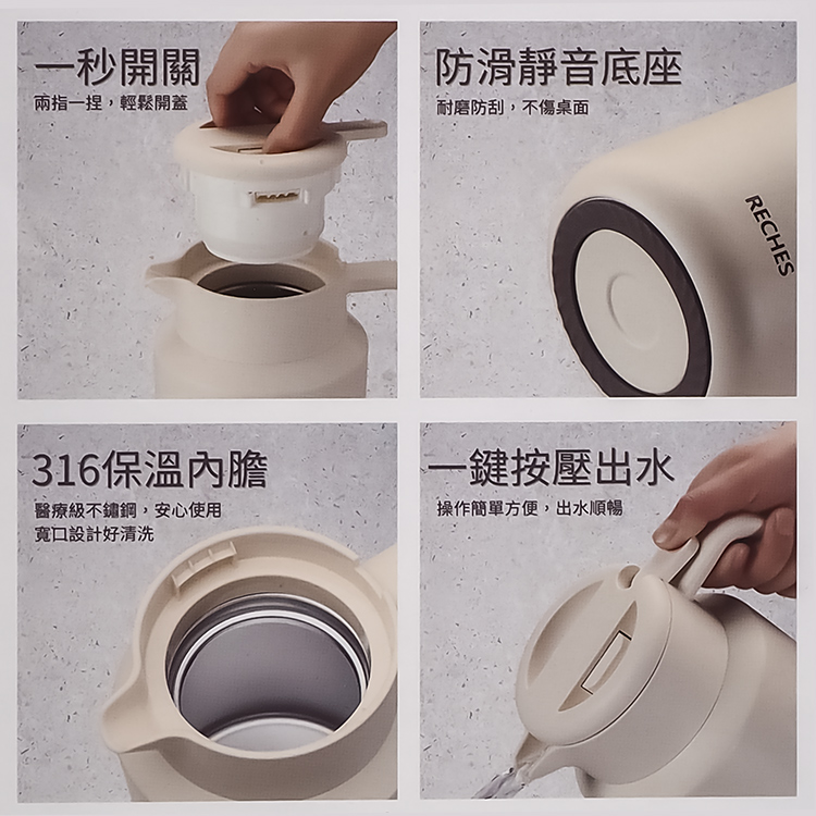 壺身內膽採用316不鏽鋼,外層採用304不鏽鋼材質,上蓋按壓式開蓋設計一手搞定,具保冷保溫雙用途,造型優美時尚,堅固耐用,清洗方便,造型時尚,一鍵出水按壓式給水,瓶口加大,冰塊容易放入,不論在家中、辦公室,隨時隨地都能享受透沁涼的冰飲和熱騰騰香濃的咖啡或下午茶。