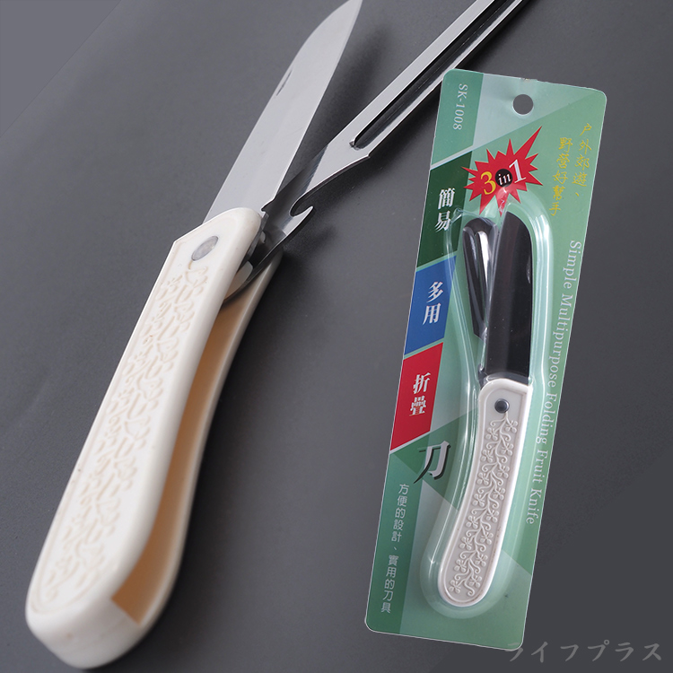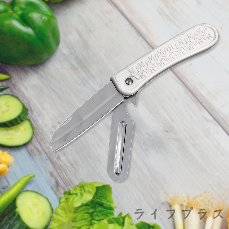 採用不鏽鋼製造,鋒利好切,適用於切水果,折疊式設計輕巧不笨重,可折疊收納、可削皮、可開瓶多功能使用,好沖好洗,好握好拿,廚房好幫手。