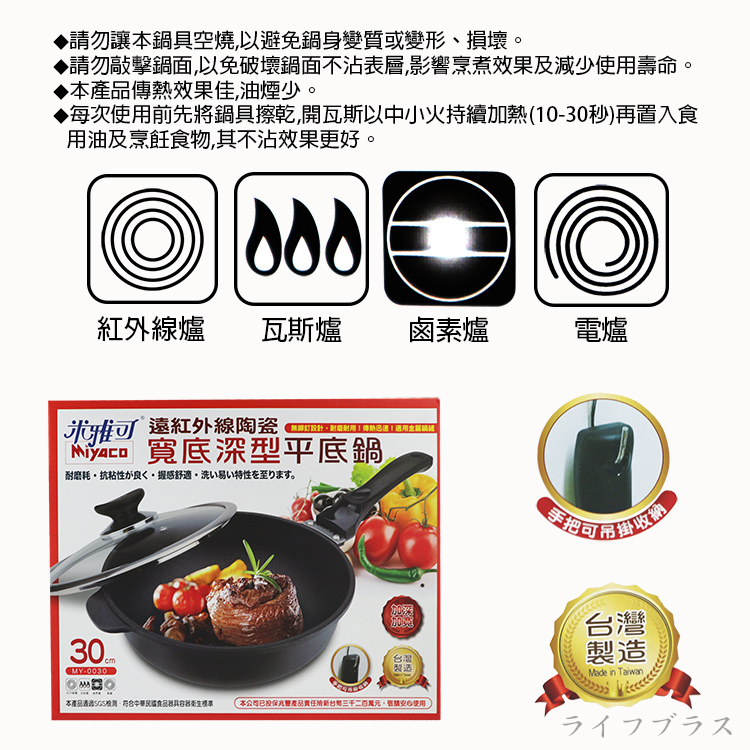 在廚房中,擁有一款優質的鍋具是烹飪成功的關鍵,此款鍋具台灣製造品質安心,通過SGS檢測品質安心,採用台灣傳統手工合金鑄造精工製作,鍋身特殊螺紋結構,增加表面硬度,適用圓角金屬鐵鏟,無鉚釘一體成型設計,不卡油垢好清洗,傳熱快且均勻,採用遠紅外線陶瓷耐用不沾塗層處理,達到不沾鍋身抗黏OK,不易粘黏食材,煎煮食材只需少許油 ,省油,省瓦斯,平底加深加寬型化設計,料理食物好鍋具,適用瓦斯爐、電爐、紅外線爐、鹵素爐,不適用IH電磁爐,讓您輕鬆掌控每一道料理。