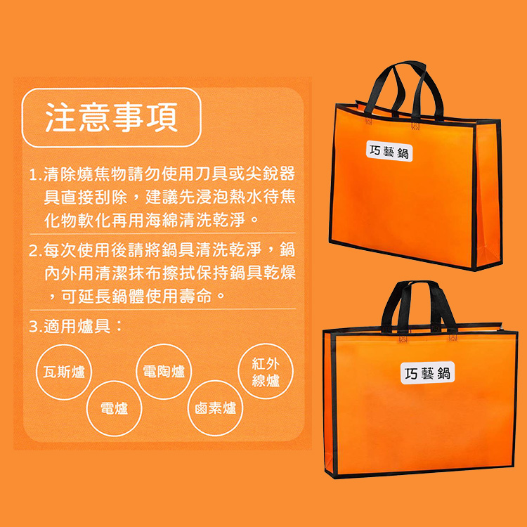 注意事項: 棉布沾少許食用油在鍋內塗之濕潤,烹調時只需少量食用油即可不沾鍋身。 每次烹飪完畢時,請務必將鍋內水分清理乾淨,請勿置放長時或隔夜。 第一次使用,將鍋身內外洗淨,小火烘乾鍋身。鍋具表層請不要用鐵鏟敲擊,避免出現凹點或痕跡影響鍋面品質。請勿使用鐵刷、鋼絲球,以延長使用壽命。