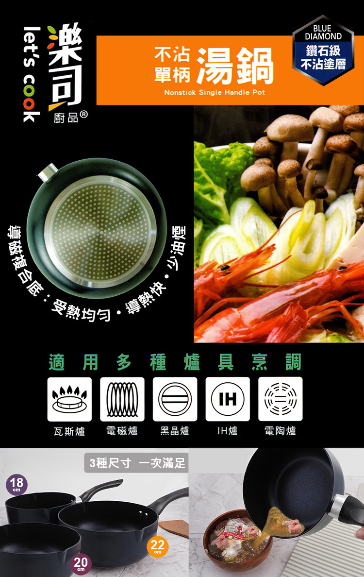 材 質:合金 / 430導磁不鏽鋼 / 鑽石級不沾塗層 / 電木手把