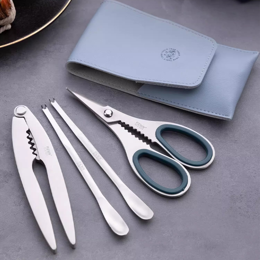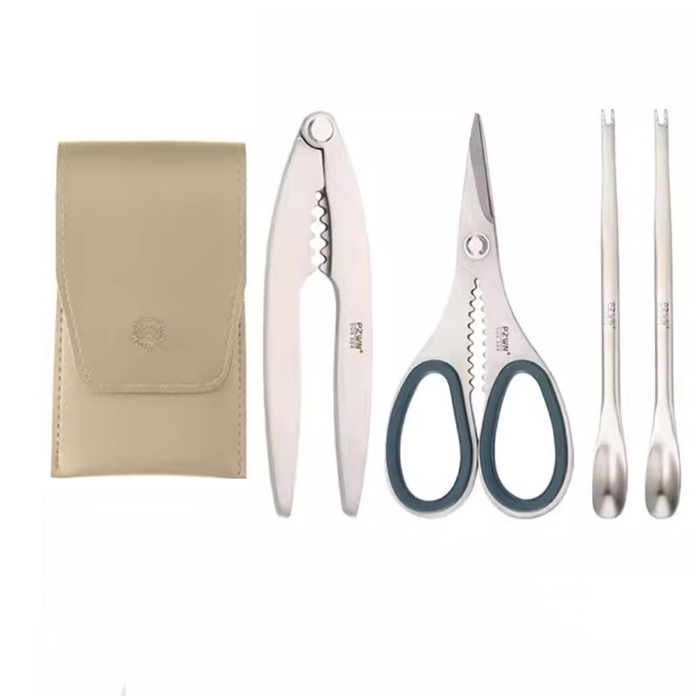 內容物:蟹鉗x1、蟹剪x1、雙頭蟹叉勺x2、PU皮收納套x1