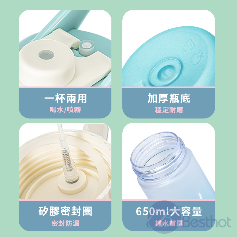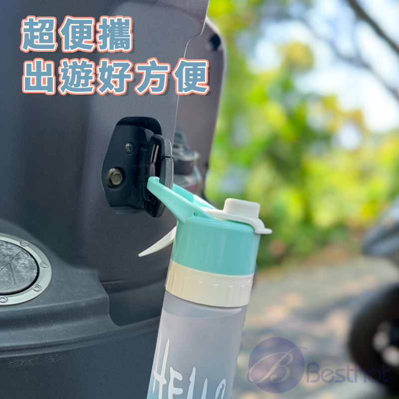 喝水樂趣多,可喝可噴夏日超實用;一體式把手,戶外使用可掛可手提;矽膠密封圈,不畏懼傾倒攜帶輕便;一按即噴霧,食品級材質安心使用。