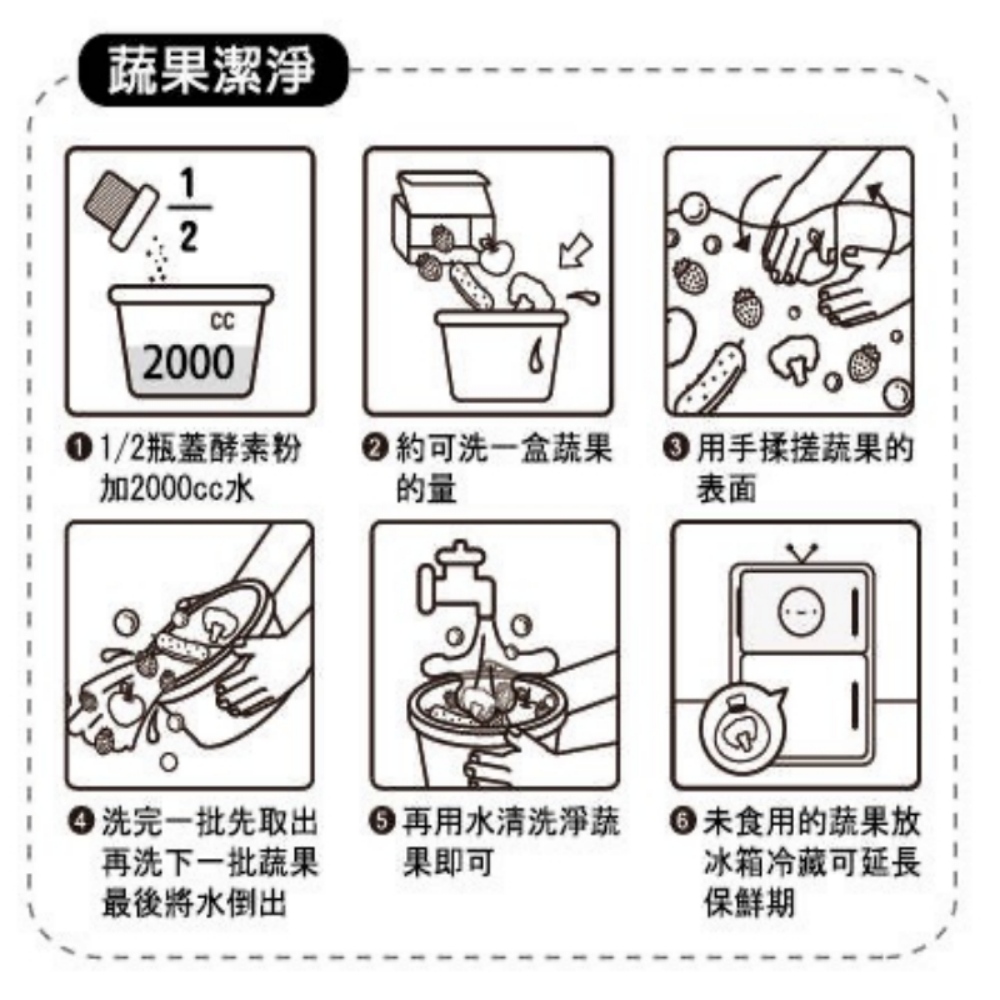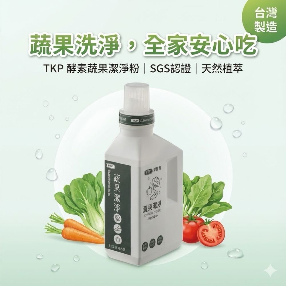 ※使用範圍:◆油膩餐具鍋具◆廚房污漬污垢◆蟑螂蚊蟲孳生◆水槽管道油膩阻塞※使用方式1.取適當容器,以粉1/3匙+水1000cc,將酵素與清水混合。40度溫水效果最好2.將蔬果直接浸泡酵素清潔洗劑中商品規格品名:TKP速酵清植萃酵素 蔬果清潔粉成分:酵素、甜菜鹼、焙用鹼、乳酸桿菌、螯合劑保存期限:5年製造日期:如包裝打印容量:700公克/附量匙1隻製造工廠:同豪科技股份有限公司生產地:台灣保存方法:請勿存放在陽光直射及潮濕之處,並應注意置於嬰幼兒無法取得的地方。※環保酵素洗劑沒有使用抗凝結劑,與空氣接觸袋內可能會有些許結塊,輕按即可散開。※因超商取貨有5KG的重量限制.超過需分開下單或改選宅配,謝謝