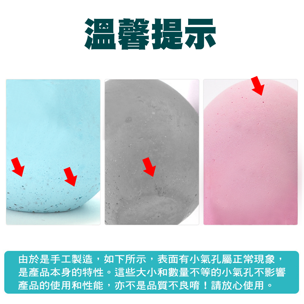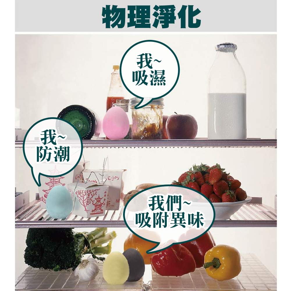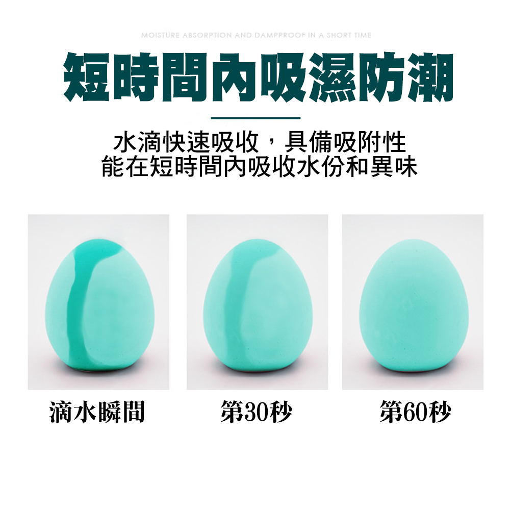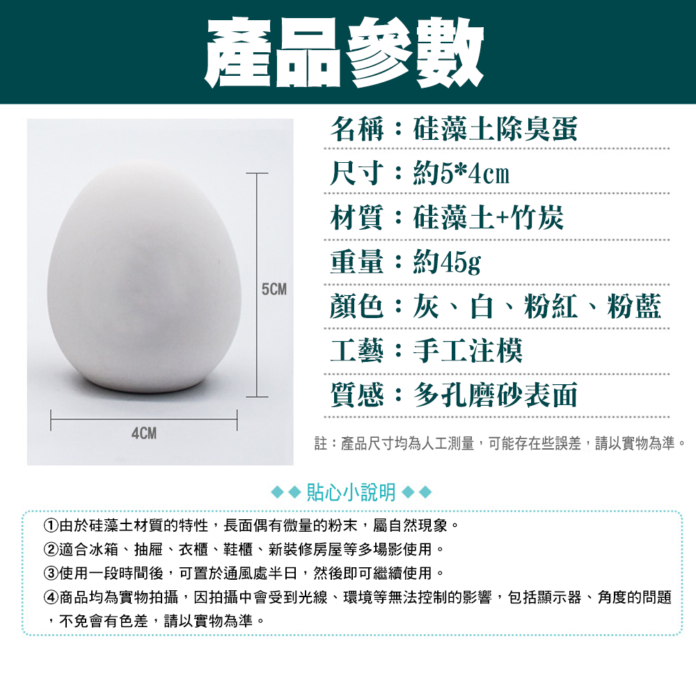 你家的冰箱也這樣嗎?打開異味撲鼻而來!!!食物未分類,互相串味冰淇淋吃得出魚味?麵包吸附肉味?『硅藻土除濕蛋 冰箱除臭蛋』一個蛋的除臭能力約等於500包活性碳其密度為水的0.6倍吸水率是自身動量的2-4倍故可迅速吸水、快速風乾隨時保持乾燥。【產品特色】天然硅藻土:硅藻土,是被稱為「硅藻」的單細胞植物死亡後經過1至2萬年左右的堆積期,形成一種化石性的硅藻堆積土礦床,它主要由古代硅藻的遺骸所組成。活性竹碳:選用3年以上高山毛竹為原料,經數千度高溫燒製而成。其分子細密多孔,質地堅硬具有很強的吸附能力。能淨化空氣、消除異味、吸濕防潮、抑菌驅蟲。物理淨化: 硅藻土蛋表面有無數小孔,能有效吸收冰箱食物散發的異味,可以保持局部空間環境干燥,不易滋生細菌及發霉,保持環境清新。【注意事項】①由於硅藻土材質的特性,長面偶有微量的粉末,屬自然現象。②適合冰箱、抽屜、衣櫃、鞋櫃、新裝修房屋等多場影使用。③使用一段時間後,可置於通風處半日,然後即可繼續使用。④商品均為實物拍攝,因拍攝中會受到光線、環境等無法控制的影響,包括顯示器、角度的問題,不免會有色差,請以實物為準。【溫馨提示】由於是手工製造,如下所示,表面有小氣孔屬正常現象,是產品本身的特性。這些大小和數量不等的小氣孔不影響產品的使用和性能,亦不是品質不良唷!請放心使用。【產品參數】名稱:硅藻土除臭蛋尺寸:約5*4cm材質:硅藻土+竹炭重量:約45g顏色:灰、白、粉紅、粉藍工藝:手工注模質感:多孔磨砂表面