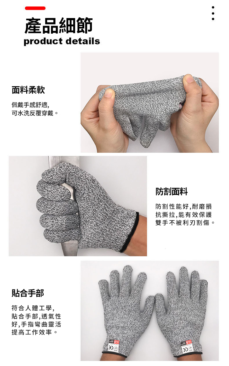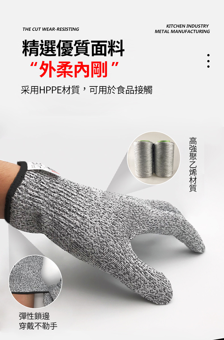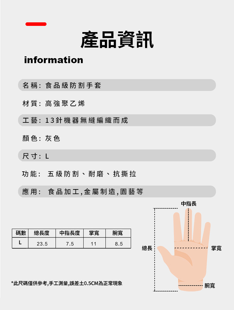 ● 無懼刀刃防止割傷● 防割耐磨柔軟透氣● 穿戴舒適貼合手部款式:單一款尺碼:L材質:高強聚乙烯尺寸:如圖片所示重量:55g材積:14*26*1.5cm包裝內容物:本體*1對