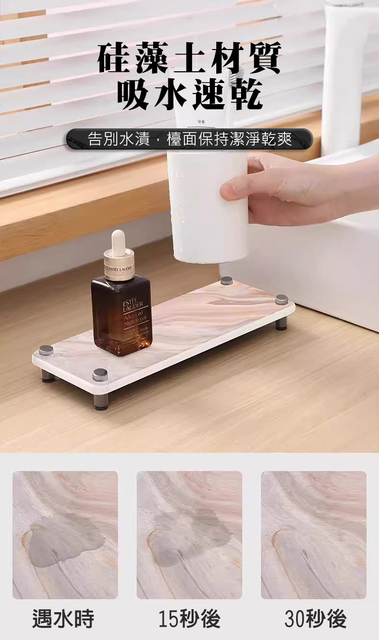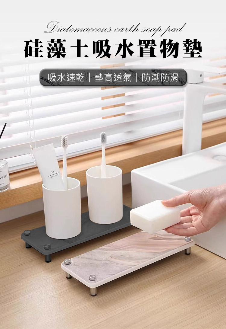 精緻的三色大理石花紋為您的洗漱區或廚房增添了一抹現代感不僅適用於擺放刷牙用品和化妝品還能置於小盆栽下方吸水保持乾燥設計簡約優雅,為您的生活空間增色不少【產品訊息】產品/硅藻土洗漱墊材質/硅藻土、不銹鋼、橡膠尺寸/10*25*2.5cm