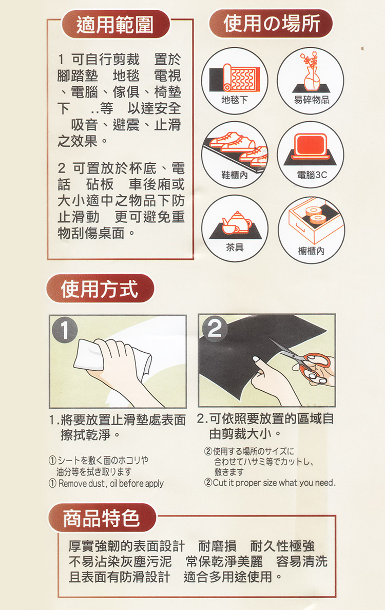 加大尺寸60x160cm,特殊止滑材質,特殊表面無孔不卡污,質地柔軟,止滑效果佳,可水洗,不易撕裂不易爛,可自行裁剪各種造型,方便使用,多用途可使用需防滑地方。