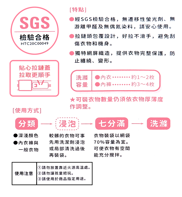 台灣製造品質安心,不易脫線不開口,無染材質通過SGS檢驗合格,使用安全又安心,防止衣物損壞變形保護衣物,防止衣物糾結不傷衣物,分類洗衣輕鬆曬衣服,不用再為了打結衣物而傷腦筋,使用方便,洗衣好幫手。