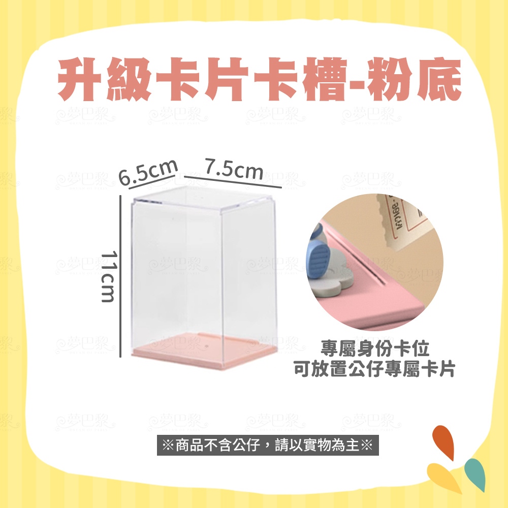 🔸公仔展示盒🔸✨密封防潮、防落灰✨透明高清,每隻公仔都完美展示✨自由疊加,堆疊展示不怕倒✨插卡槽設計,收藏更完整▲ 產品規格:1. 材質:壓克力2. 尺寸:如圖所示3. 顏色:透明底、白底、粉底