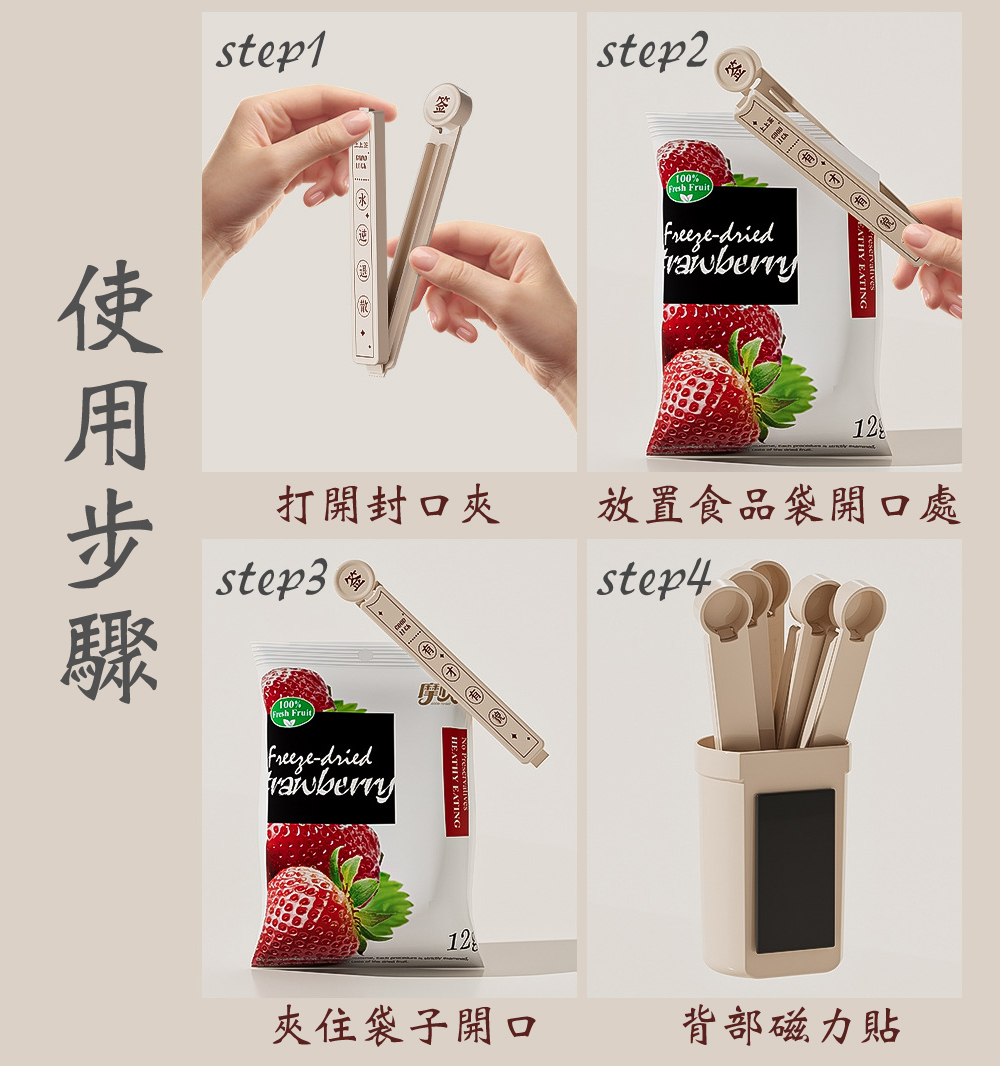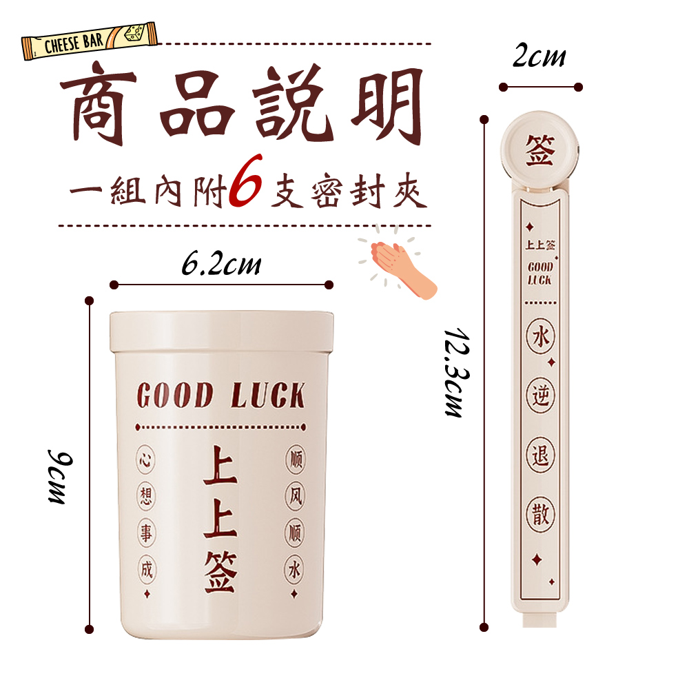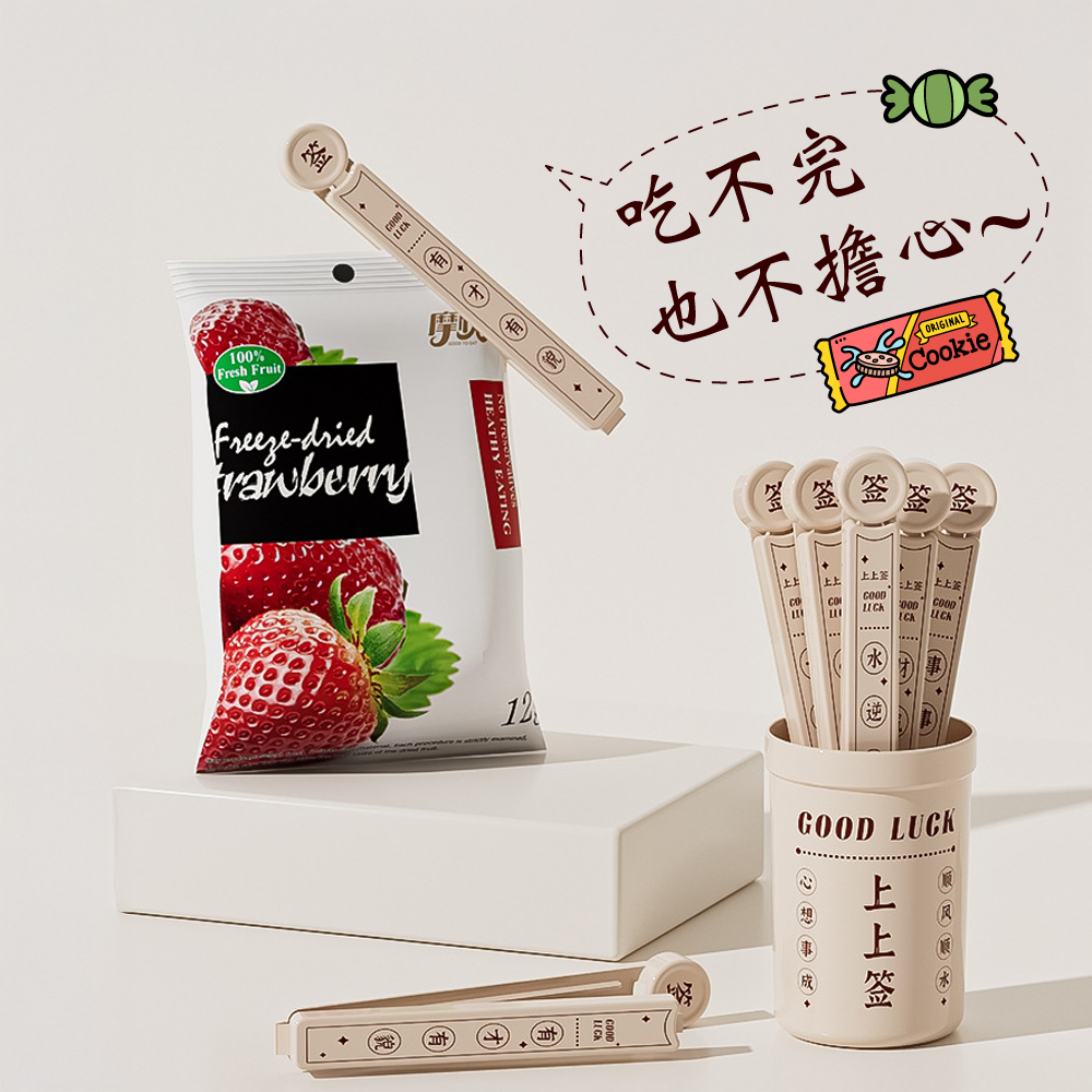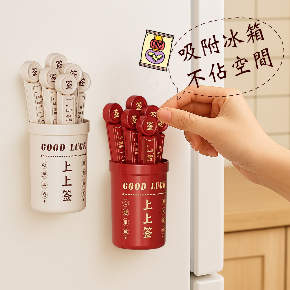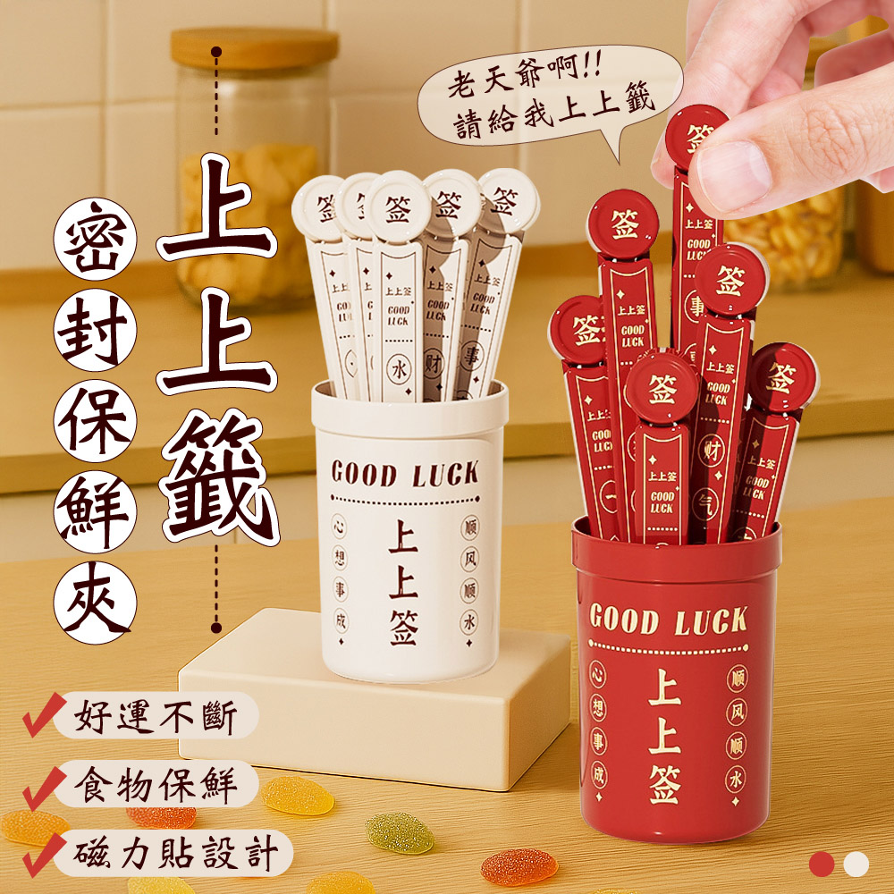🍀 上上籤密封保鮮夾 🍀 抽好運,鎖鮮味!✨ 產品特色🔮 每支都有不同祝福,抽出好運帶來好心情🔒 內部雙凹槽設計,密封效果更出色,告別食物受潮📌 收納盒背面磁力設計,可直接吸附冰箱,節省廚房空間👌 卡扣按壓設計,開合輕鬆不費力🌈 多色選擇:典雅米色、喜慶紅色🥐 適用於各種零食、穀物、餅乾等食物保鮮💕 生活小確幸📅 每天開零食時抽出一支,享受驚喜小確幸🎁 精美設計,送禮自用兩相宜🏠 廚房收納好幫手,讓雜亂的塑膠袋有序擺放🍪 食物不再受潮,省錢又減少浪費💪 堅固耐用,一次購買長久使用📋 產品規格📏 收納盒尺寸:9 x 6.2cm📏 密封夾尺寸:12.3 x 2cm📦 商品內容:6支密封夾+1個收納盒🧲 背面採用磁力貼設計,可吸附於冰箱上上籤密封保鮮夾,不只是實用的保鮮小物,更是帶來好運的生活小確幸!每天抽一支,好運好心情都抽出來~🥰✨