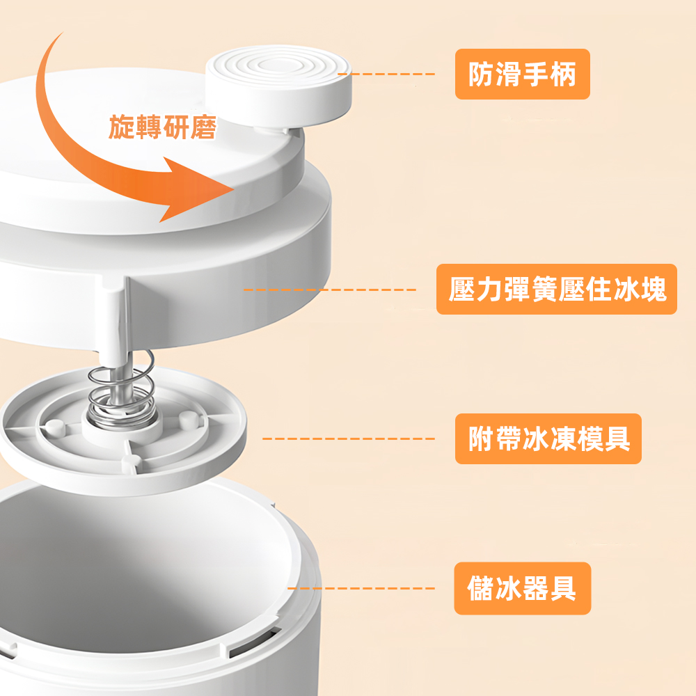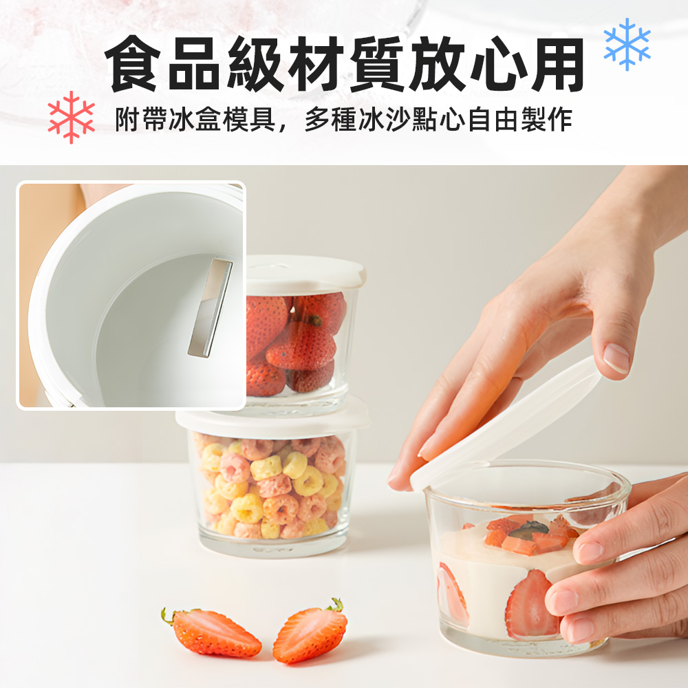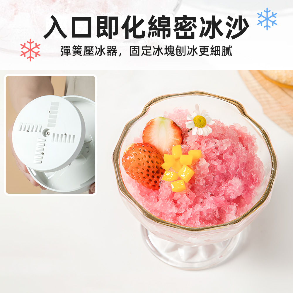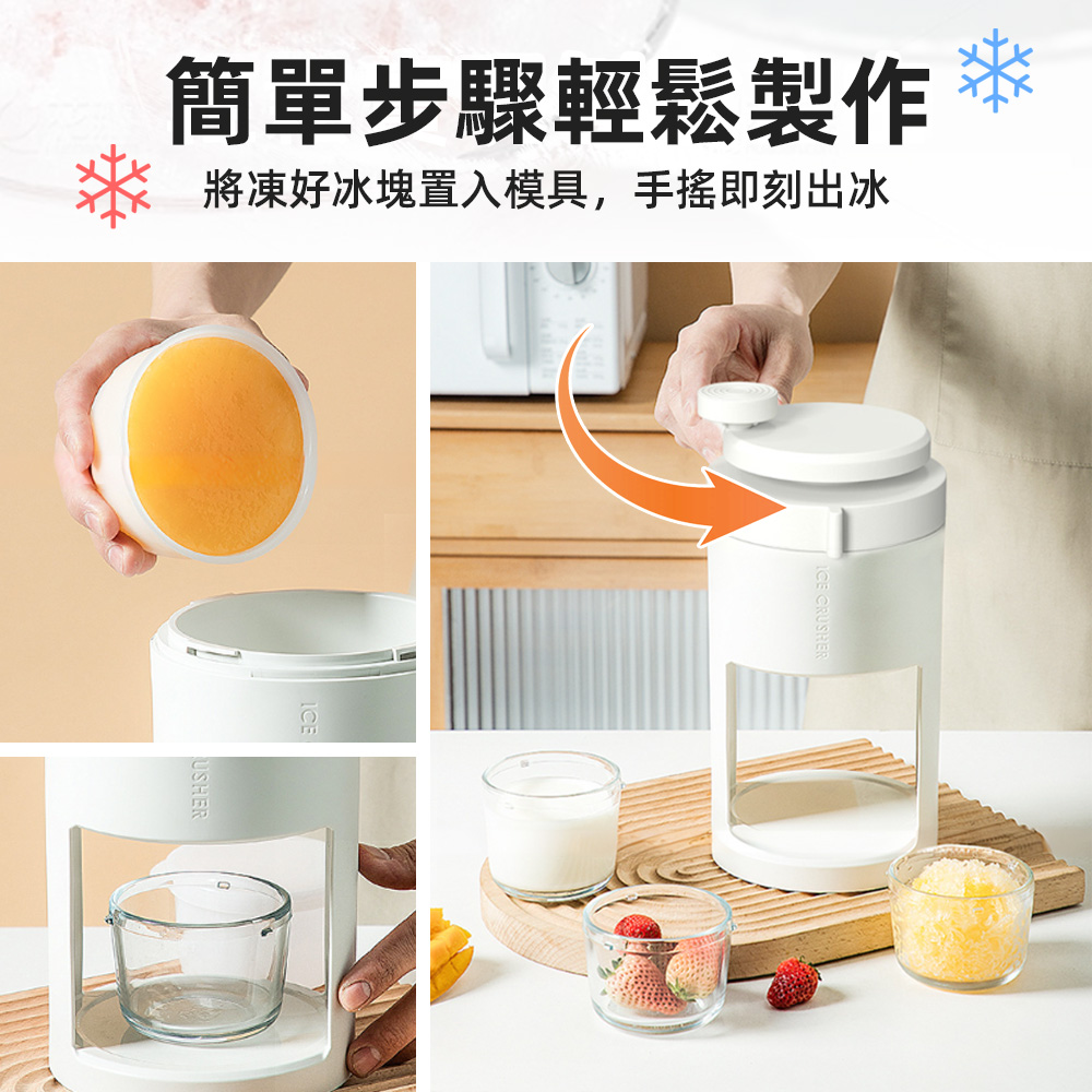 這款手搖刨冰機,特別適合喜歡在家自製甜品的你,解決了想隨時享受清涼卻又怕麻煩的困擾。簡約無手柄的設計,不僅美觀也方便收納。只要將附贈模具做好的冰塊放入,輕輕轉動頂部手柄,就能刨出如雪花般細緻的冰沙,搭配新鮮水果,一份安心又美味的夏日甜品輕鬆上桌。