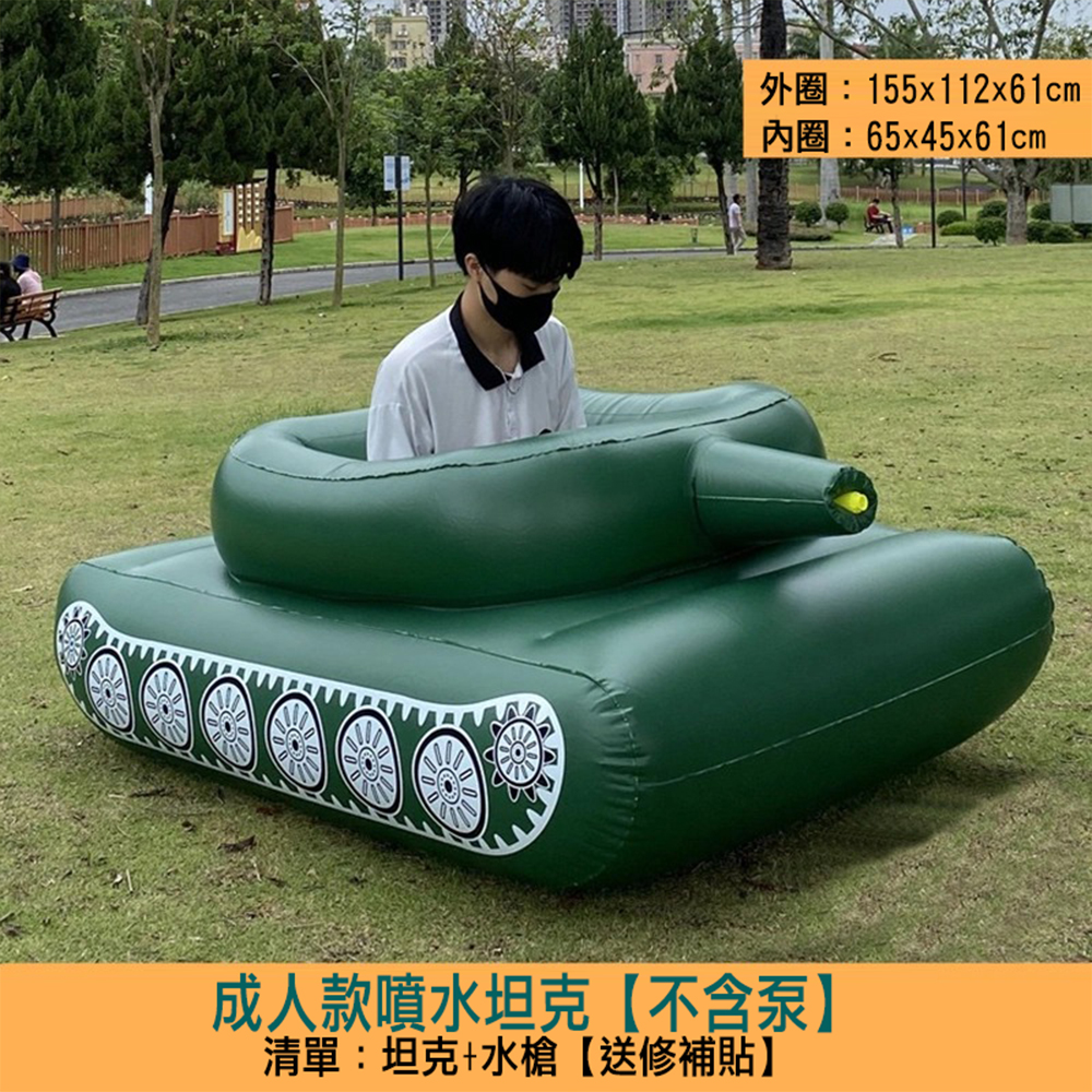 Adult-sized water battle tanks, inflatable water-spraying vehicles, inflatable swim rings, outdoor water toys.