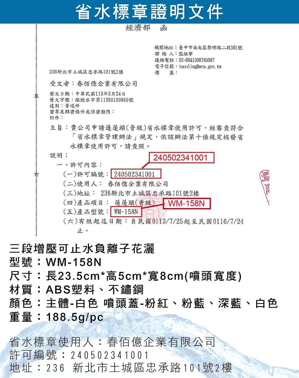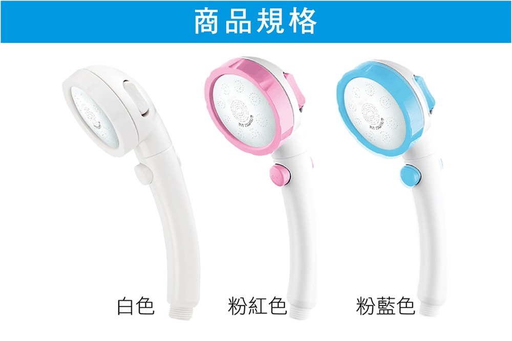 品名:三段增壓可止水負離子花灑 型號:WM-158N尺寸:長23.5cm*高5cm*寬8cm(噴頭寬度) 材質:ABS塑料、不鏽鋼 顏色:主體-白色 噴頭蓋-粉紅、粉藍、白色(隨機出貨)重量:188.5g/pc 省水標章使用人:春佰億企業有限公司許可編號:240502341001地址:236 新北市土城區忠承路101號2樓