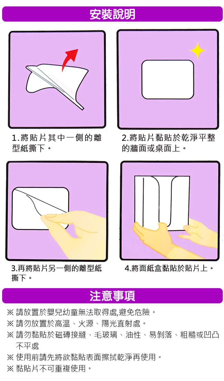 ▲隨意黏貼黏貼性強不傷牆面,簡單組裝輕鬆收取面紙
