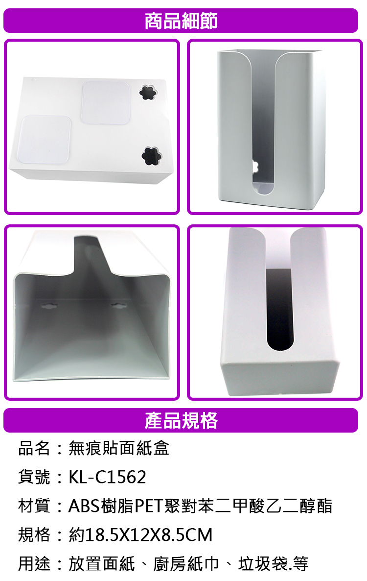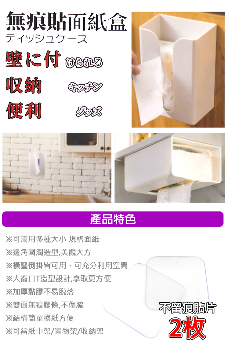 極簡設計收納方便,黏貼性強不殘膠不傷牆面,免釘免鑽孔簡單組裝,可隨意黏貼瓷磚、大理石、木板、塑膠、金屬,超強承重,輕鬆抽取面紙,創意巧思簡約工藝,裝飾在客廳、房間、廁所都是相當美觀實用,更換面紙更加方便。
