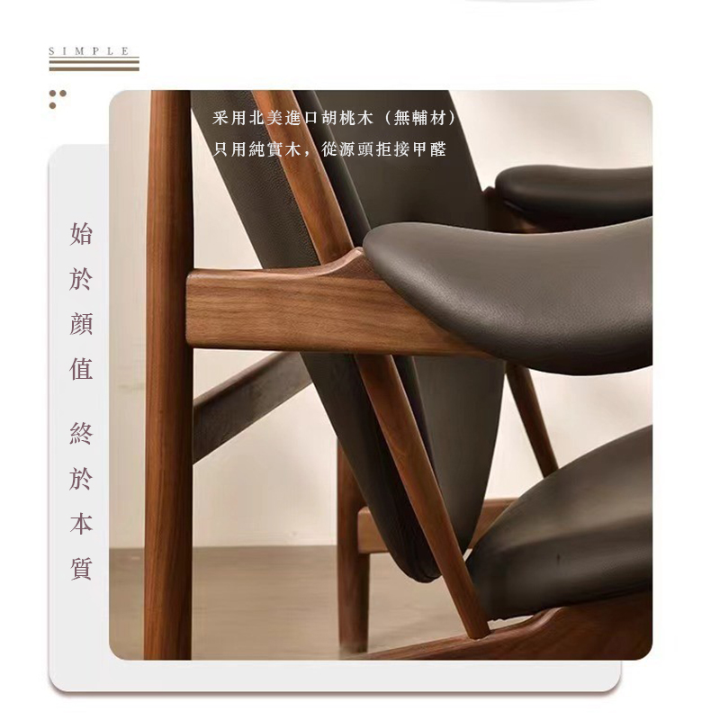 酋長椅|丹麥設計經典FAS 級北美黑胡桃木 × 105° 人體工學|收藏級單椅FAS 級白蠟木 × 105° 人體工學|性價比單椅✔ 全球最具代表性的 15 把大師椅之一✔ 丹麥設計之父 Finn Juhl 經典之作✔ 100% 純實木・拒絕貼皮與人造板🏆 設計背景|不是仿款,是經典原型1949 年,由「丹麥設計之父」Finn Juhl與工藝大師 Niels Vodder 聯手打造。📌 被譽為丹麥現代主義代表作📌 收藏家、設計師、建築師指定單椅這是一張被寫進設計史的椅子。🌳 用料說明|只用真正的好木頭北美進口 FAS 級黑胡桃木,整體結構 100% 純實木北美進口 FAS 級白蠟木,筆直清晰,清爽現代不用貼皮、不用人造板,大板直拼,從源頭拒絕甲醛📌 每一把胡桃木木紋皆不同📌 天然差異=獨一無二🔸 水滴紋|溫潤柔和🔸 波浪紋|流動自然🔸 鳥啄紋|稀有獨特🔸 大山紋|層次立體🔸 直綫紋|經典耐看🔸 金瘤紋|端莊大氣木蠟油塗裝|保護木頭,也保留質感植物性木蠟油塗裝,深入木材纖維,非表面上漆保留實木觸感與自然呼吸感✔ 紋理更清晰✔ 色澤更溫潤✔ 越用越好看🛋 坐感設計|久坐不累的關鍵▸ 105° 人體工學後傾坐面與椅背維持黃金角度背部自然貼合,久坐不壓迫▸ 55cm 超寬坐深正坐、斜坐、盤坐都舒適馬鞍式寬扶手:完整承托手臂真皮包覆坐墊:觸感細膩、支撐到位高密度回彈海綿:不塌陷、不疲乏✅ 適合誰購買?✔ 想找一張「能坐很多年」的單椅✔ 重視設計感與空間質感✔ 不想買大量感工業家具✔ 喜歡實木、皮革與手工細節📦 購買提醒(常見 QA)本商品為 天然實木,木紋與色澤略有差異屬正常現象皮革為真皮材質,隨使用會產生自然使用痕跡