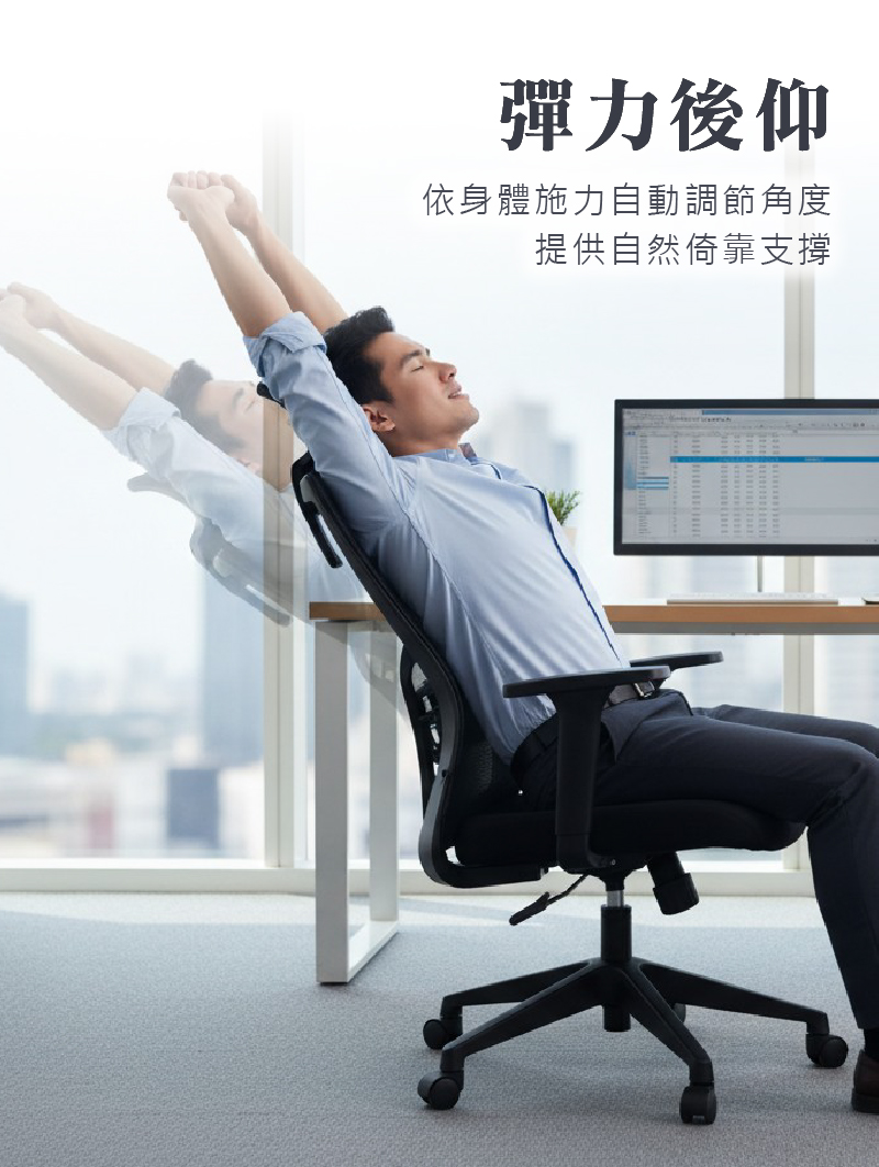 後靠順應重力彈性靠背,達到舒適角度。