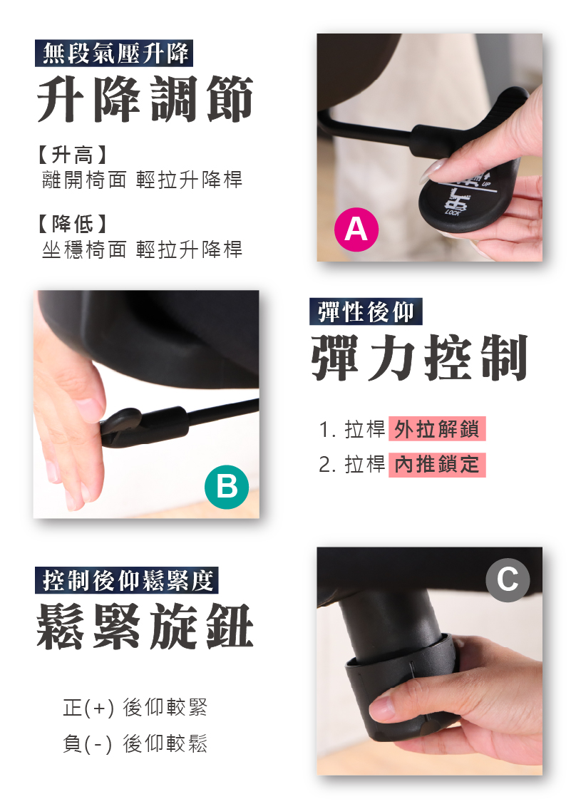 ★無段式氣壓升降使用惰性氣體填充的SGS認證氣壓棒,安全性極高,無爆衝危險。