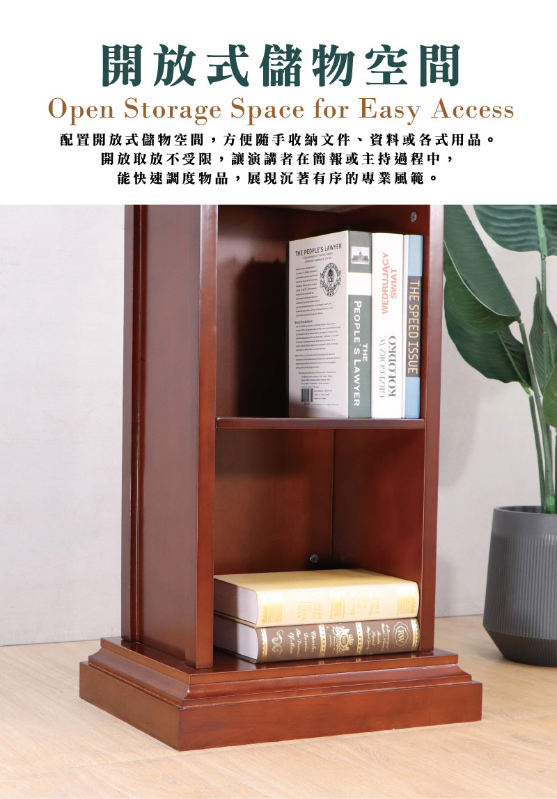 方便隨手收納文件、資料或各式用品。開放取放不受限,讓演講者在簡報或主持過程中,能快速調度物品,展現沉著有序的專業風範。