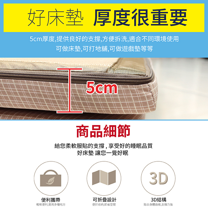 ★台灣製造,品質保證★3D立體結構設計,良好支撐透氣更舒適★5cm最剛好的厚度★三折疊設計,方便收納★可拆洗,抑菌潔淨好安心