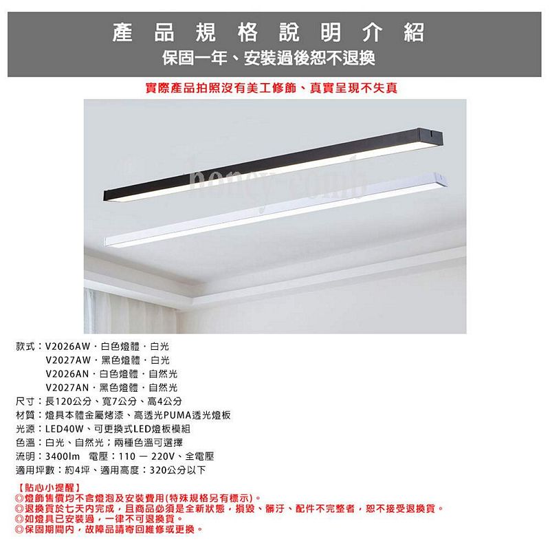 款式: V2026AW.白色燈體.白光 V2027AW.黑色燈體.白光 V2026AN.白色燈體.自然光 V2027AN.黑色燈體.自然光 尺寸:長120公分、寬7公分、高4公分 材質:燈具本體金屬烤漆、高透光PUMA透光燈板 光源:LED40W、可更換式LED燈板模組 色溫:白光、自然光;兩種色溫可選擇 流明:3400lm 電壓:110 – 220V、全電壓 適用坪數:約4坪、適用高度:320公分以下 保固一年、安裝過後恕不退換 ◎燈飾售價均不含燈泡及安裝費用(特殊規格另有標示)。 ◎退換貨於七天內完成,且商品必須是全新狀態,損毀、髒汙、配件不完整者,恕不接受退換貨。 ◎如燈具已安裝過,一律不可退換貨。 ◎保固期間內,故障品請寄回維修或更換。