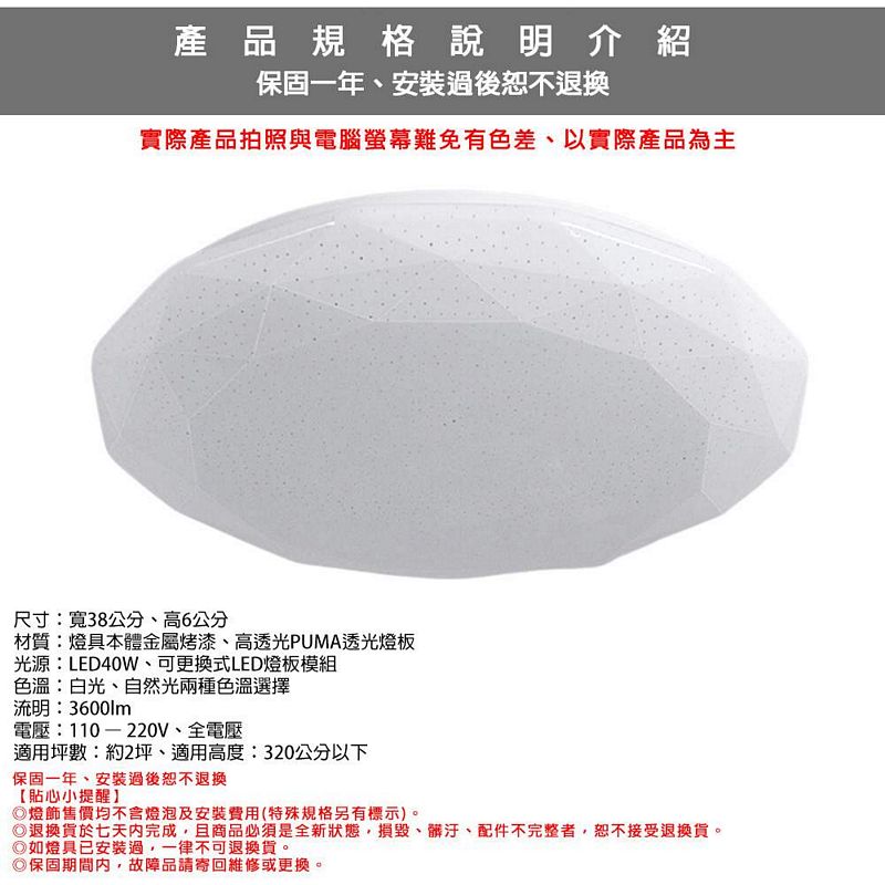 尺寸:寬40公分、高6公分 材質:燈具本體金屬烤漆、高透光PUMA透光燈板 光源:LED40W、可更換式LED燈板模組 色溫:白光、自然光兩種色溫選擇 流明:3600lm 電壓:110 – 220V、全電壓 適用坪數:約2坪、適用高度:320公分以下