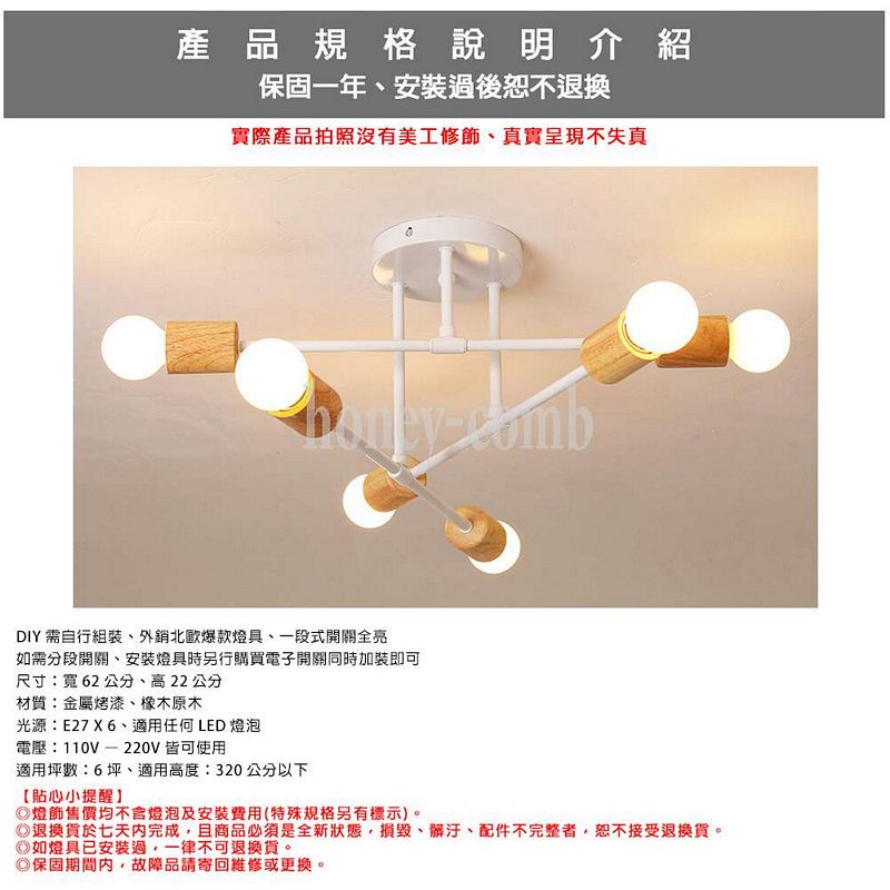 DIY需自行組裝、外銷北歐爆款燈具、一段式開關全亮 如需分段開關、安裝燈具時另行購買電子開關同時加裝即可 尺寸:寬62公分、高22公分 材質:金屬烤漆、橡木原木 光源:E27 X 6、出廠不含燈泡,燈泡另計,適用任何LED燈泡 電壓:110V – 220V 皆可使用 適用坪數:6坪、適用高度:320公分以下