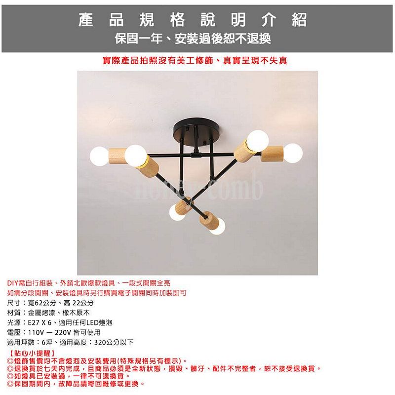 DIY需自行組裝、外銷北歐爆款燈具、一段式開關全亮 如需分段開關、安裝燈具時另行購買電子開關同時加裝即可 尺寸:寬62公分、高22公分 材質:金屬烤漆、橡木原木 光源:E27 X 6、出廠不含燈泡,燈泡另計,適用任何LED燈泡 電壓:110V – 220V 皆可使用 適用坪數:6坪、適用高度:320公分以下