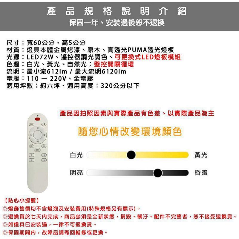 尺寸:寬60公分、高5公分 材質:燈具本體金屬烤漆、原木、高透光PUMA透光燈板 光源:LED72W、遙控器調光調色、可更換式LED燈板模組 色溫:白光、黃光、自然光;壁控開關循環 流明:最小流612lm / 最大流明6120lm 電壓:110 – 220V、全電壓 適用坪數:約六坪、適用高度:320公分以下