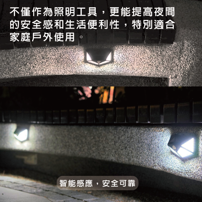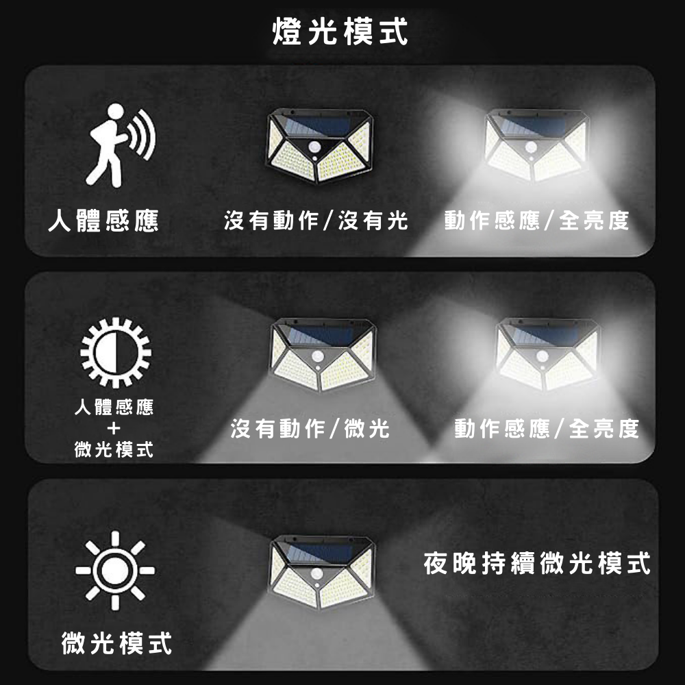 三種亮燈模式100 個 超亮型LED燈180°廣角照明 為廣闊區域提供明亮的照明IP65 防塵防水 颱風下雨照常亮燈適用於花園 庭院 車庫 後院 階梯 走道等台灣工廠銷售 售後服務完善