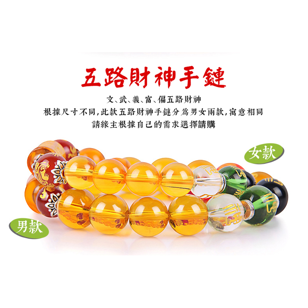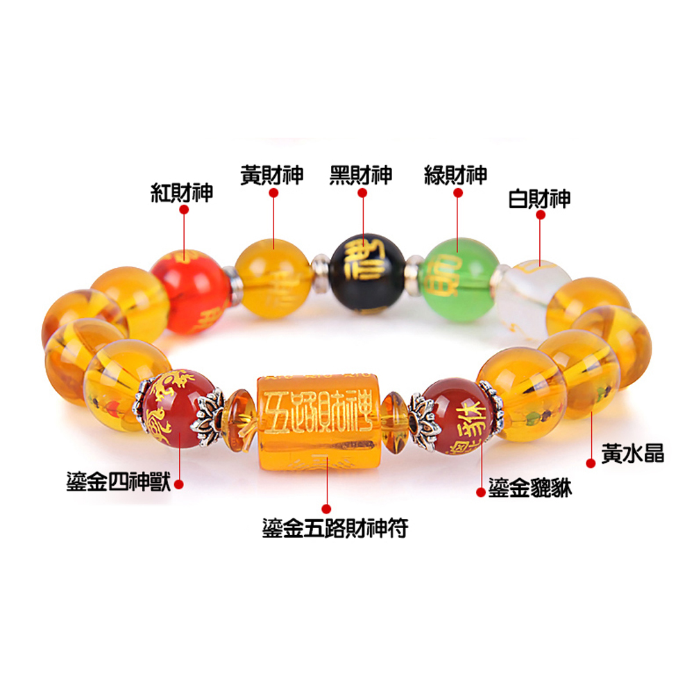 此手鍊含五路財神,分別以不同顏色的水晶與黑曜石配成。
