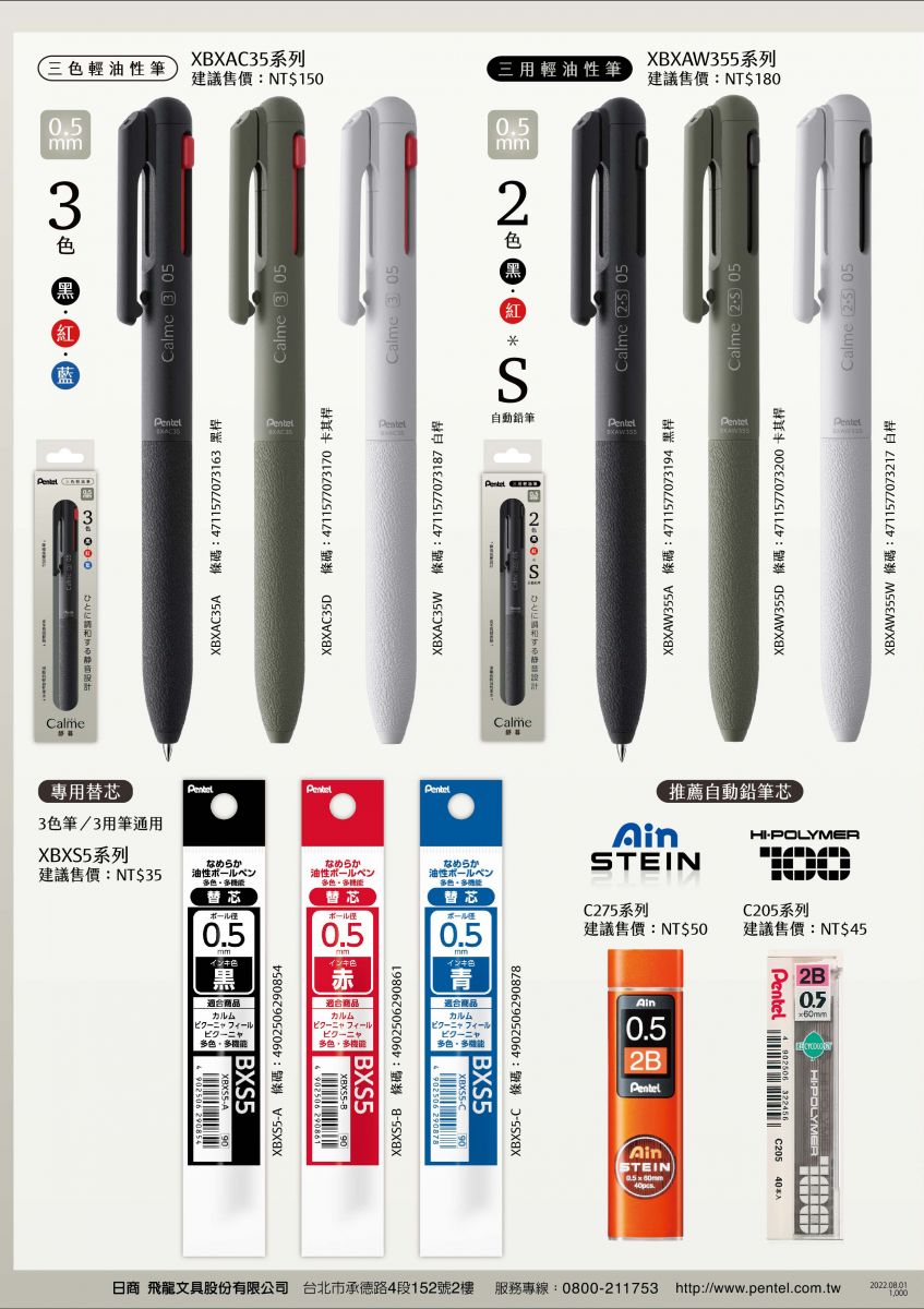 【 Pentel 飛龍 】 Calme靜暮 三色輕油性筆-黑+紅+藍 0.5mm /支 XBXAC35 - 多款可選