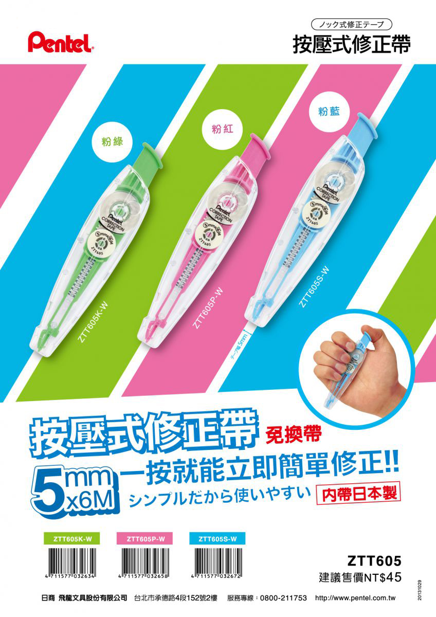 【 Pentel 飛龍 】 按壓式修正帶(免換內帶)5mm 24支/盒 ZTT605 - 多款可選