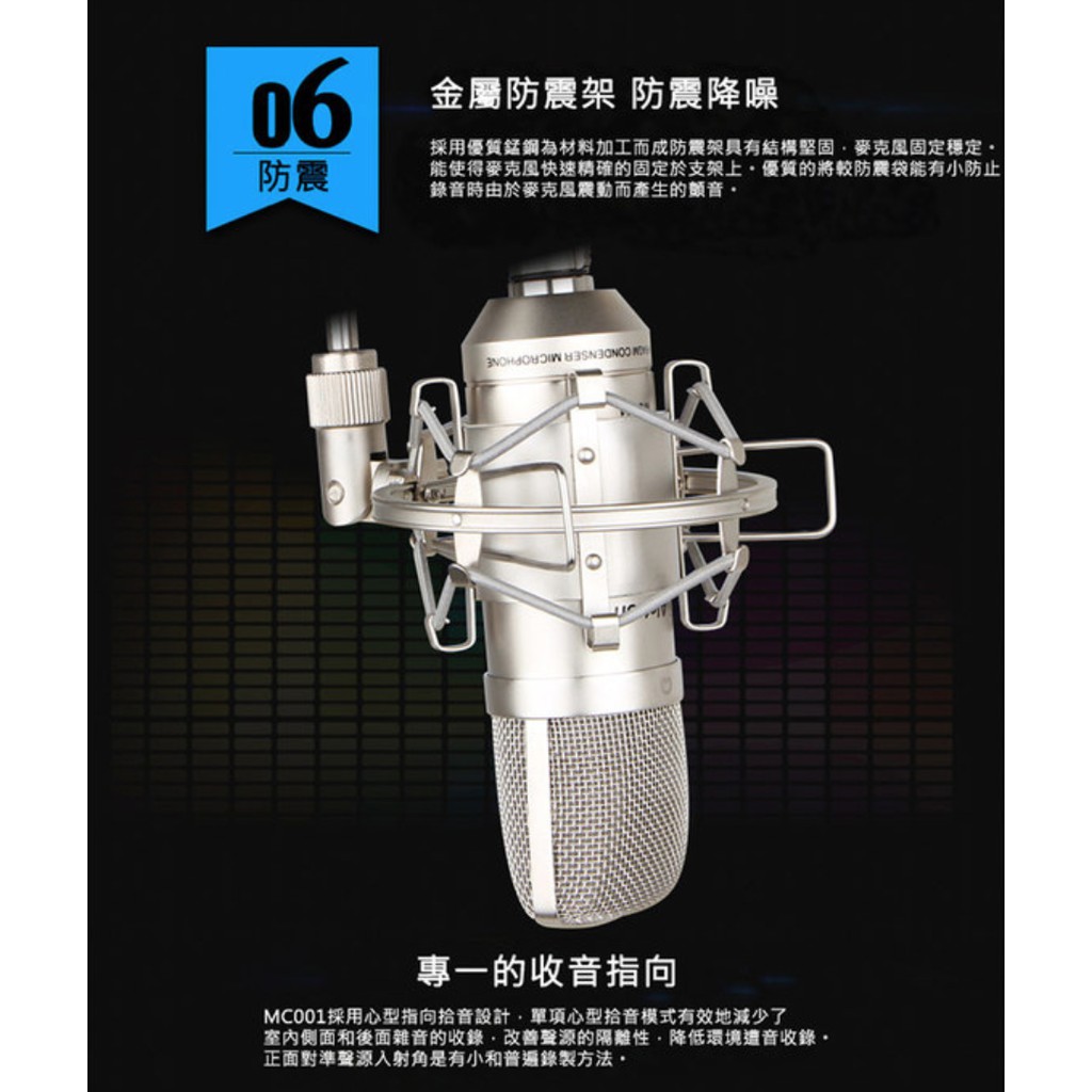 1材質 優質材料 抗磁耐用MC001電容麥克風外殼採用優質金屬材料為原料加工而成, 具有良好的防銹抗磁能力,已效降低電磁干擾。圓滑的外殼 具有良好的觸感,整體美觀簡潔。 2工藝 電鍍工藝 防銹防刮採用先進得全自動電鍍珍珠鎳工藝處裡, 使其具有珍珠般光滑亮麗的外觀。優質的電鍍層具有良好的抗刮、防銹、耐腐蝕、抗氧化性能。 3過濾 優質網罩 多層過濾採用兩層優質黃酮網經過數控沖壓成型。 外網採用強度較高的粗銅網,具有一定的抗壓性能,內網採用均用而 細密的細銅網,對氣流和口水進行有效過濾,從而對音頭提供了出色的保護, 有效防止破音和齒音產生,從而不影響聲音的清晰度,提供高品質的聲音還原。 4線路 專業線路設計 高效清晰 MC001線路是我公司專業工程師已FET電子電路為基拙,選用優質 元器件經過仔細搭配,調試設計而成。使其具有快速精細聲音處理 能力,使得處理的聲音具有清晰通透,層次分明。內置低切開關, 可有效降低低頻噪音。 5聲音 寬廣頻率響應 精細聲音還原 MC001電容麥克風採用了我公司自主設32mm鍍金大振膜音頭, 3微米的特質薄膜,對聲場的感應具有良好的靈敏度,保證了拾取 音質的結實、細膩、真實感,為您捕捉聲音細微的訊號。 6防震 金屬防震架 防震降噪 採用優質錳鋼為材料加工而成防震架具有結構堅固,麥克風固定穩定。 能使得麥克風快速精確的固定於支架上。優質的將較防震袋能有小防止 錄音時由於麥克風震動而產生的顫音。 專一的收音指向 MC001採用心型指向拾音設計,單項心型拾音模式有效地減少了 室內側面和後面雜音的收錄,改善聲源的隔離性,降低環境遭音收錄。 正面對準聲源入射角是有小和普遍錄製方法。 大振膜晶體管電容麥克風 MC001是一款心型指向性大振膜晶體管電容麥克風,內置100Hz.6dB oct 低切開關。外型特別精巧、別緻,音頭部份採用了32mm大振膜鍍金音頭。 此產品具有高靈敏度、低噪音,頻帶寬等特點,而且能很好地處理高聲壓 級。是一款式和專業的樂器、人聲的錄音及現場表演,也適合廣播及舞台擴音。 類型: 大震膜單指向性晶體管電容麥克風 音頭: 32mm鍍金大振膜音頭 指向性:心型 頻率範圍:20Hz-20KHz 靈敏度:-36dB/-2dB (0dB=1V-Pa 1000Hz) 輸出阻抗: ≦200 0hms 等效噪音:20dB (A Weight) 最大聲壓級:125dB for 0.5% THD 信噪比:70dB 連接器: 3芯連線 電源: 48V幻象電源箱 使用範圍 MC001是一款心型指向性大振膜晶體管電容麥克風, 內置100Hz.6dB oct低切開關。 外型特別精巧、別緻 音頭部分採用了32mm大震膜鍍金音頭。此產品具 有高靈敏度、低噪聲,頻帶寬等特點,而且能很好地 處理高聲壓級。是一款式和專業的樂器、人聲的錄音 及現場表演,也適合廣播級舞台擴音。