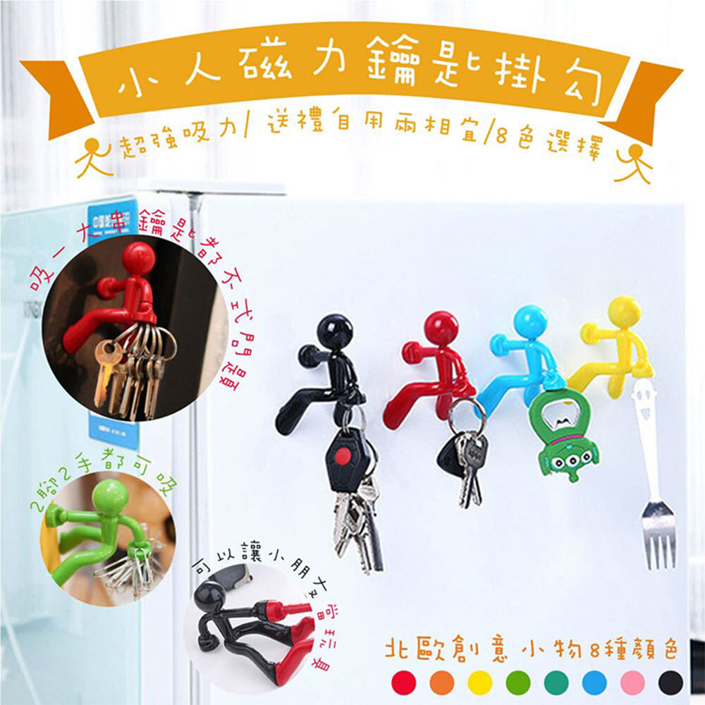 功能:出門或回家鑰匙老沒地方掛四處亂丟⁉️這傢伙可以一手拎起一堆鑰匙👍👍👍一手吸付在冰箱或金屬表面另一隻懸空小手可吸住鑰匙或金屬物質等雜物材質:ABS塑膠+強力磁鐵(兩支手.兩腳上各有1個磁鐵)尺寸:8.1 * 6 * 7.5 cm重量:50g顏色:紅色❤️、藍色💙、綠色💚、黑色🖤、粉色、深綠、黃色💛、橙色🧡是否需要組裝:否