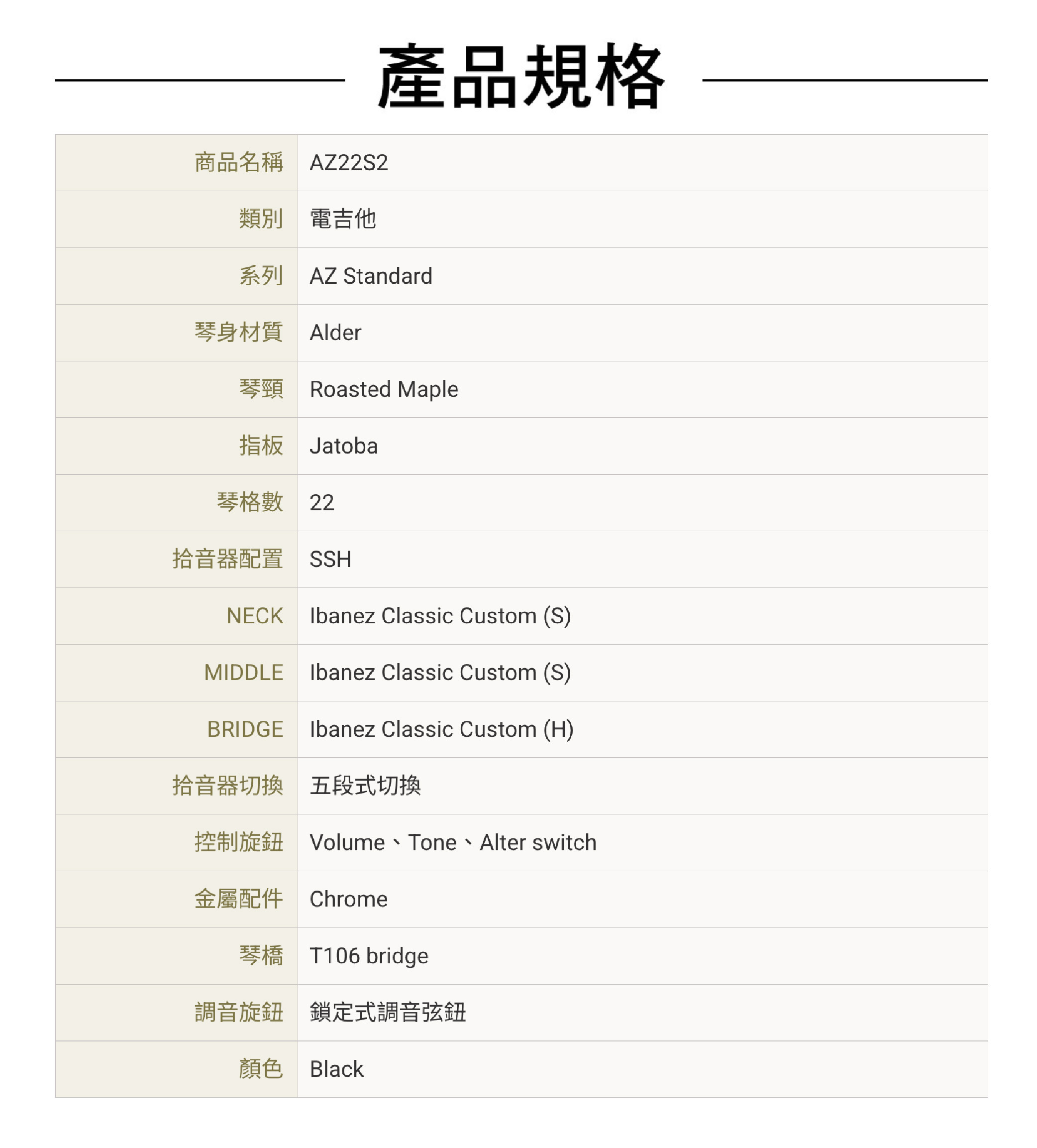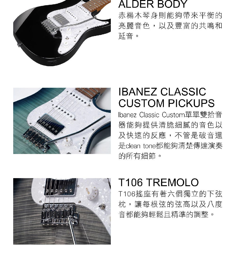琴頸段和中間段Ibanez Classic Custom單線圈、琴橋段Ibanez Classic Custom雙線圈拾音器系統