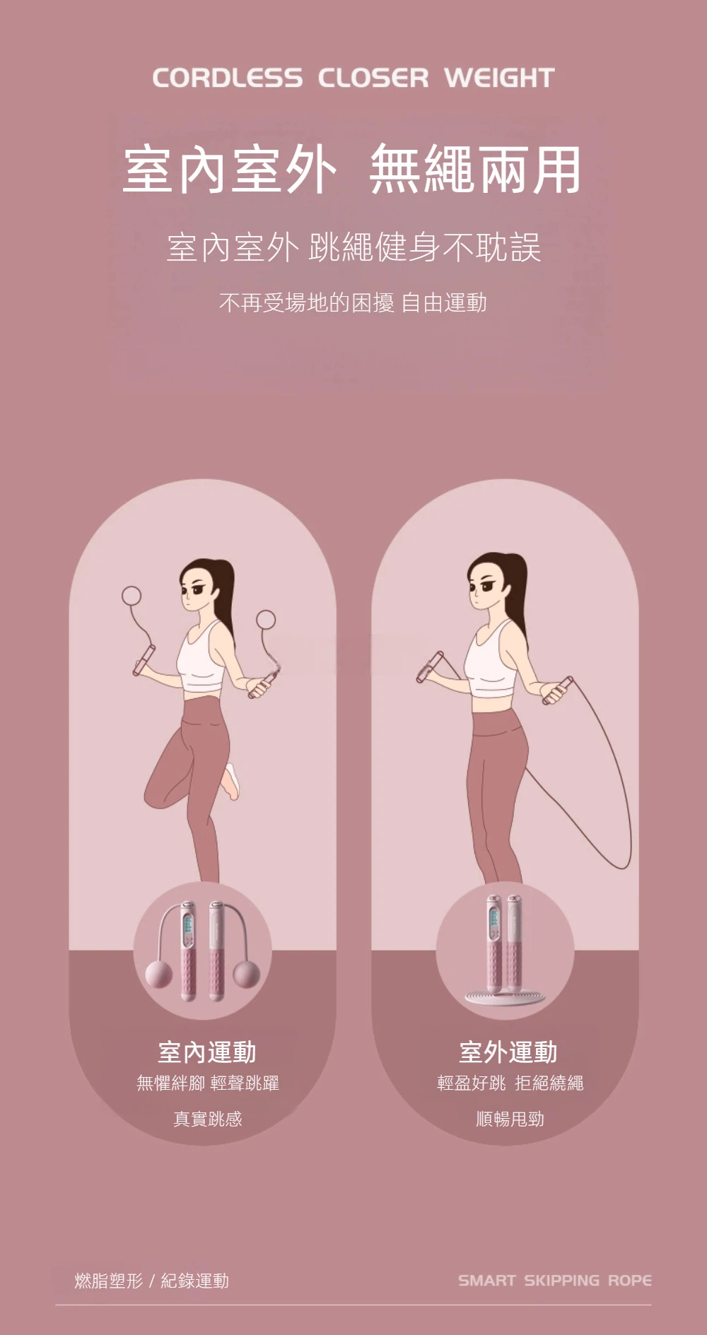 想減肥卻沒時間運動?智能計數無繩負重跳繩 幫你輕鬆開跳!不打結,室內小空間也能運動,智能計數,卡路里消耗一目了然,可調負重,燃脂效果再升級,小巧便攜,隨時隨地開始運動,減肥、塑形、健身,一繩搞定!居家運動 #減肥必備健身愛好者、減脂人士,幫助減肥燃脂,加速代謝,提升心肺功能,強化耐力,居家運動,不受場地限制,適合初學者到進階健身者,讓你隨時隨地「一跳燃脂」,健康身材輕鬆打造!