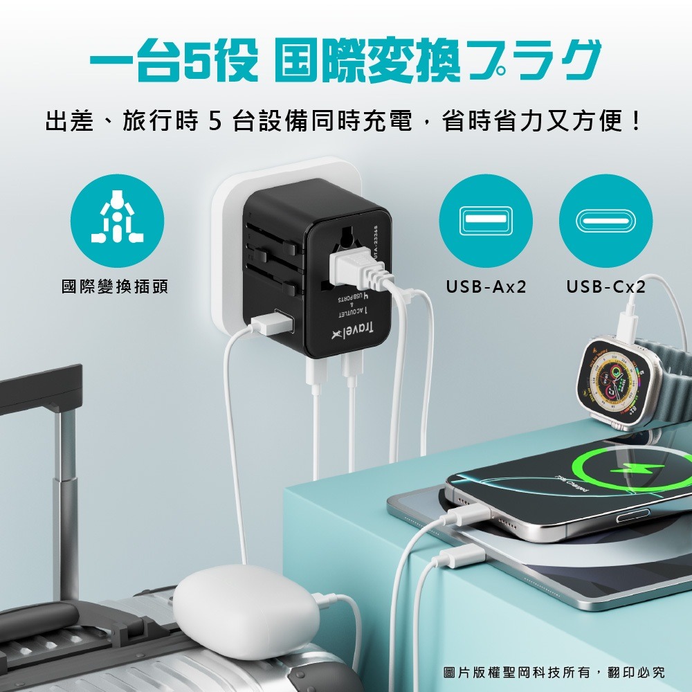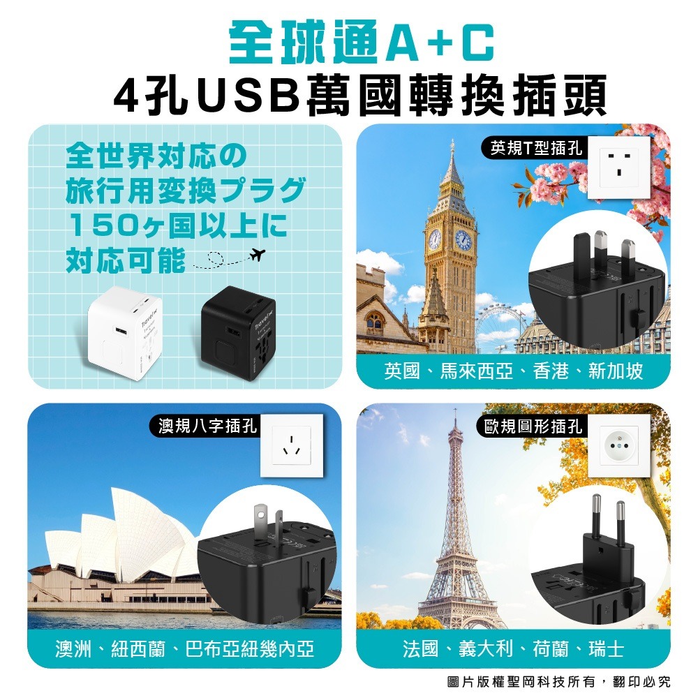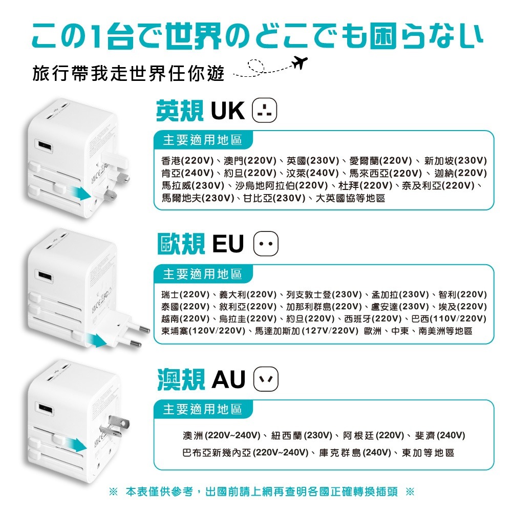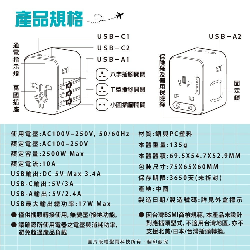使用電壓:AC100V-250V,50/60HZ額定電壓:AC100-250V額定容量:2500WMax額定電流:10AUSB輸出:DC 5VMax 3.4AUSB-C輸出:5V/3AUSB - A $ H: 5V/2.4AUSB最大輸出總功率:17W Max材質:銅與PC塑料本體重量:135g本體體積:69.5X54.7X52.9MM包裝尺寸:75 X65X60MM保存期限:3650天(未拆封)產地:中國製造日期/製造號碼:詳見外盒標示• 僅供插頭轉接使用,無變壓/接地功能。• 請確認電壓相符再使用。• 出國使用時,請確認當地電源之電壓與極性,以避免使用風險。•請確認所使用電器之電壓與消耗功率,避免超過產品負載。•因台灣BSMI商檢規範,本產品未設計對應插頭型式,不適用台灣地區,亦不支援北美/日本/台灣插頭轉換。• 產品規格如有變更,恕不另行通知。台灣地區禁用